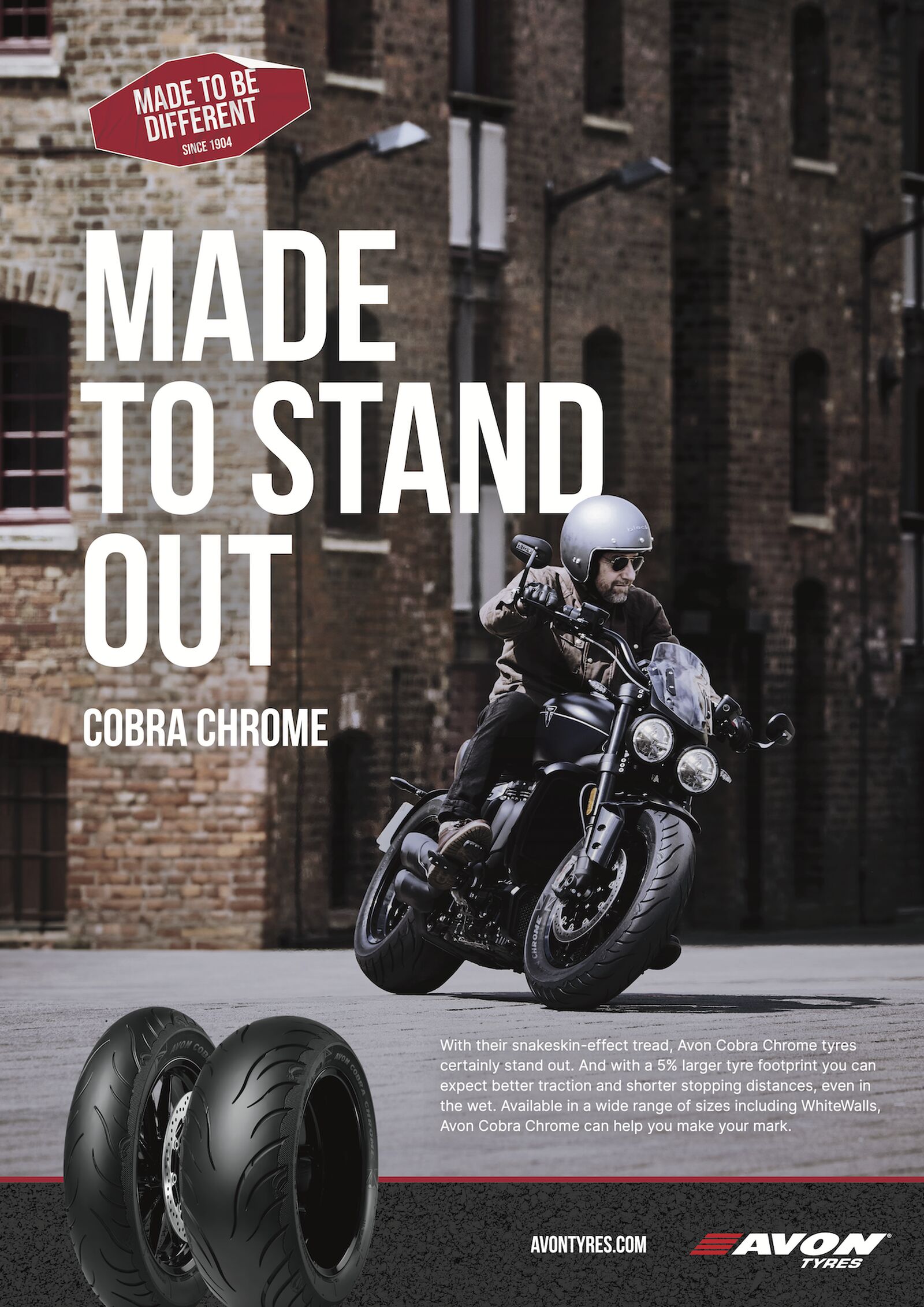 Seit der Gründung im Jahr 1904 steht die Marke Avon für eine hervorragende Qualität zu einem fairen Preis. Avon Produkte bieten nicht nur sichere Fahreigenschaften mit hoher Performance, sondern durch die unverwechselbaren Profildesigns mit ansprechender Optik auch ein ganz besonderes Fahrerlebnis. Auch in Zukunft steht die Produktqualität im Mittelpunkt der Anstrengungen des Unternehmens. So profitiert die Marke Avon von den jüngsten Investitionen in das europäische Produktions- und Kompetenzzentrum in Montlucon (Frankreich). Neben der Anschaffung hochmoderner Produktionsmaschinen wurde eine neue Fertigungsstraße für die Herstellung der Cobra Chrome Weißwandreifen geschaffen. Durch die Maßnahmen wird nicht nur eine massive Steigerung der Produktionskapazität erreicht, sondern auch eine signifikante Steigerung der Produktionsqualität. So wurden bereits vorhandene Reifengrößen von Grund auf überarbeitet, um die Reifen-Performance zu steigern und die strengen Goodyear-Unternehmensstandards und Branchenvorschriften zu erfüllen.