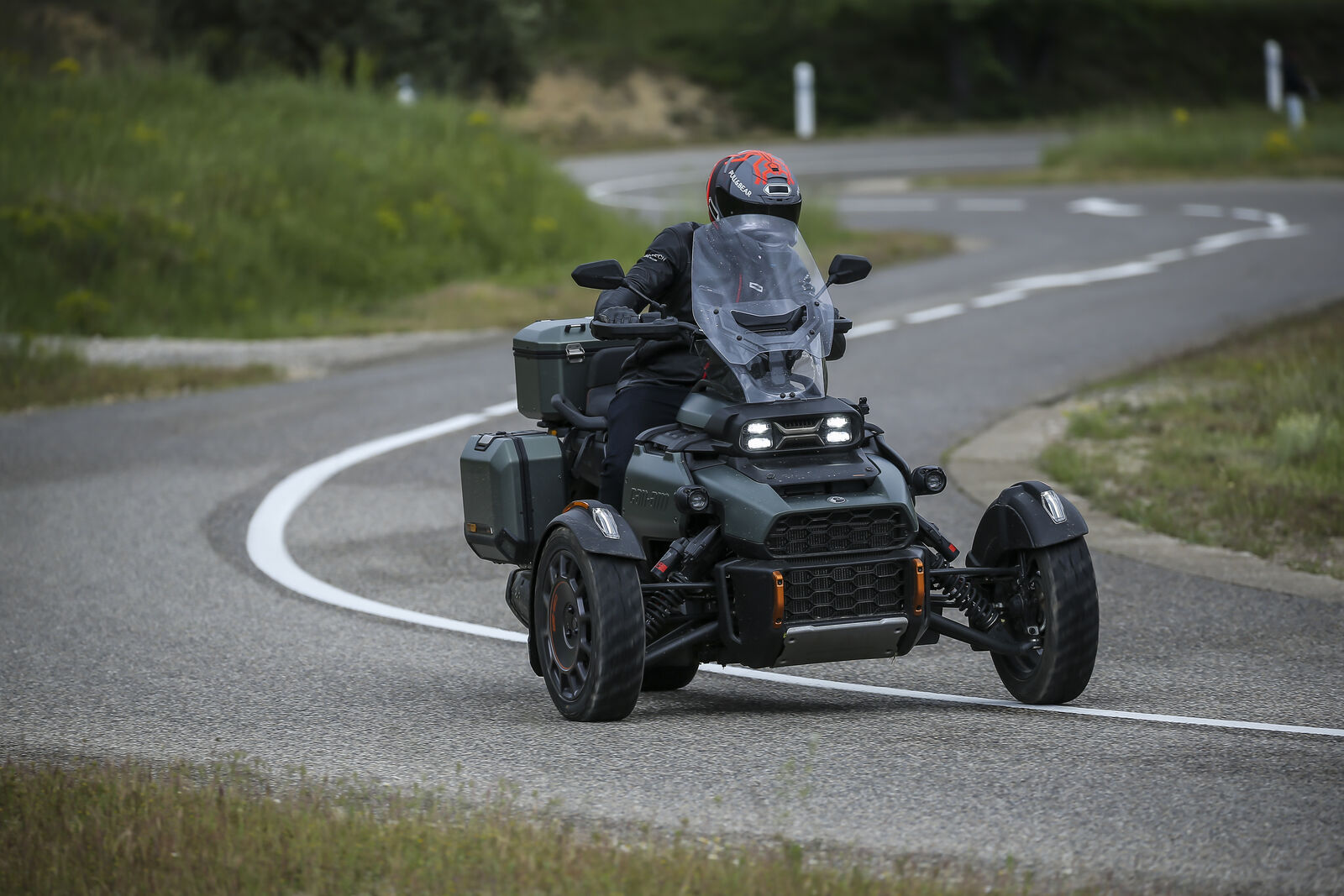 Die Canyon Redrock wurde vor allem für den Offroad-Einsatz konzipiert. Dabei bietet sie eine beeindruckende Bodenfreiheit und einen erhöhten Federweg, was das Fahren auf unbefestigten Wegen erheblich erleichtert. Während der Testfahrten in Frankreich zeigte sich schnell, dass die Canyon Redrock in der Lage ist, sich durch schwieriges Terrain zu kämpfen, ohne dabei den Fahrspaß zu verlieren. Allerdings gibt es auch Herausforderungen: Das Fahrverhalten auf der Straße ist nicht so agil wie bei anderen Modellen, was sich besonders in Kurven bemerkbar macht. Die Stabilitätskontrolle kann das Beschleunigen in engen Kurven behindern, was für erfahrene Fahrer frustrierend sein kann. Hier zeigt sich der größte Unterschied zu den sportlicheren Can-Am Modellen wie dem Spyder oder dem Ryker, die auf der Straße deutlich spielerischer sind.