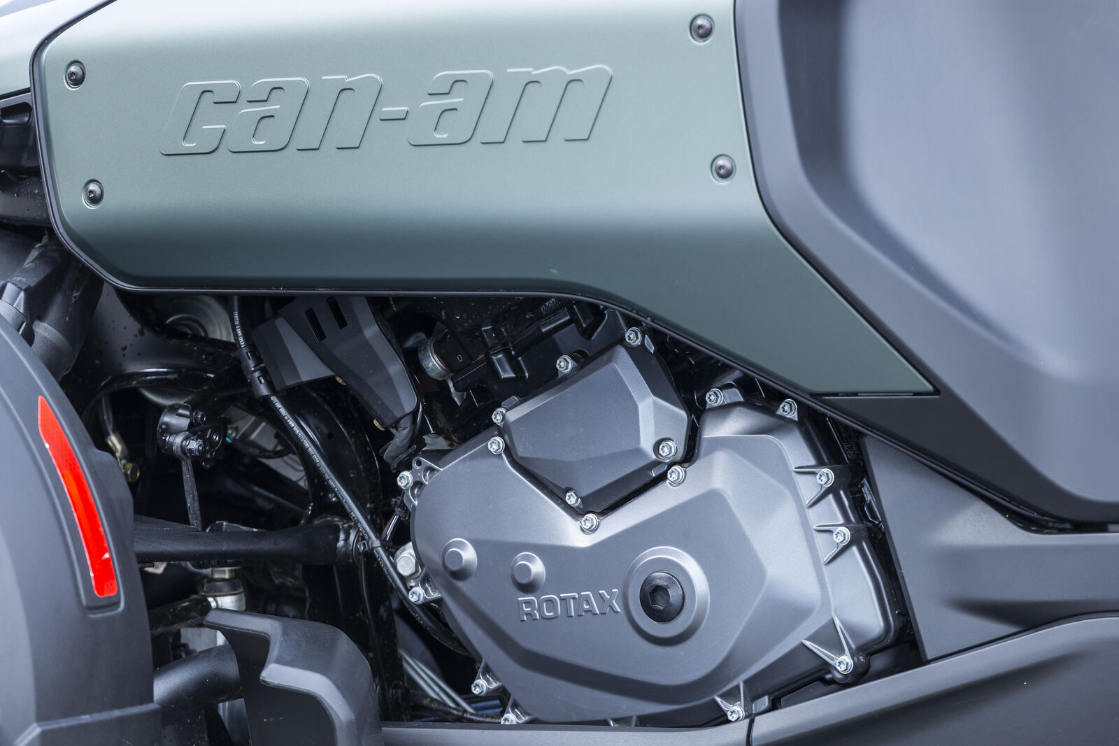 Im Herzen der Canyon Redrock schlägt der Rotax 1330 ACE Motor, ein leistungsstarker Antrieb mit 115 PS und elektronischer Kraftstoffeinspritzung. Diese Kombination sorgt für eine kraftvolle Beschleunigung und ein reibungsloses Fahrgefühl, das sowohl auf der Straße als auch im Gelände überzeugt. Das Fahren wird durch die elektronische Drosselklappensteuerung und das elektronische Servolenkungssystem zusätzlich erleichtert. Ein Highlight ist die Möglichkeit, ohne Kupplung zu schalten – dank der intuitiven Plus- und Minus-Tasten am Lenker. Man muss nur die Gänge hochschalten, während das Herunterschalten automatisch erfolgt, was eine entspannte und flüssige Fahrweise fördert. Besonders bemerkenswert ist die direkte Gasannahme, die in Kombination mit den verschiedenen Fahrmodi für jedes Terrain ein individuelles Fahrgefühl ermöglicht.