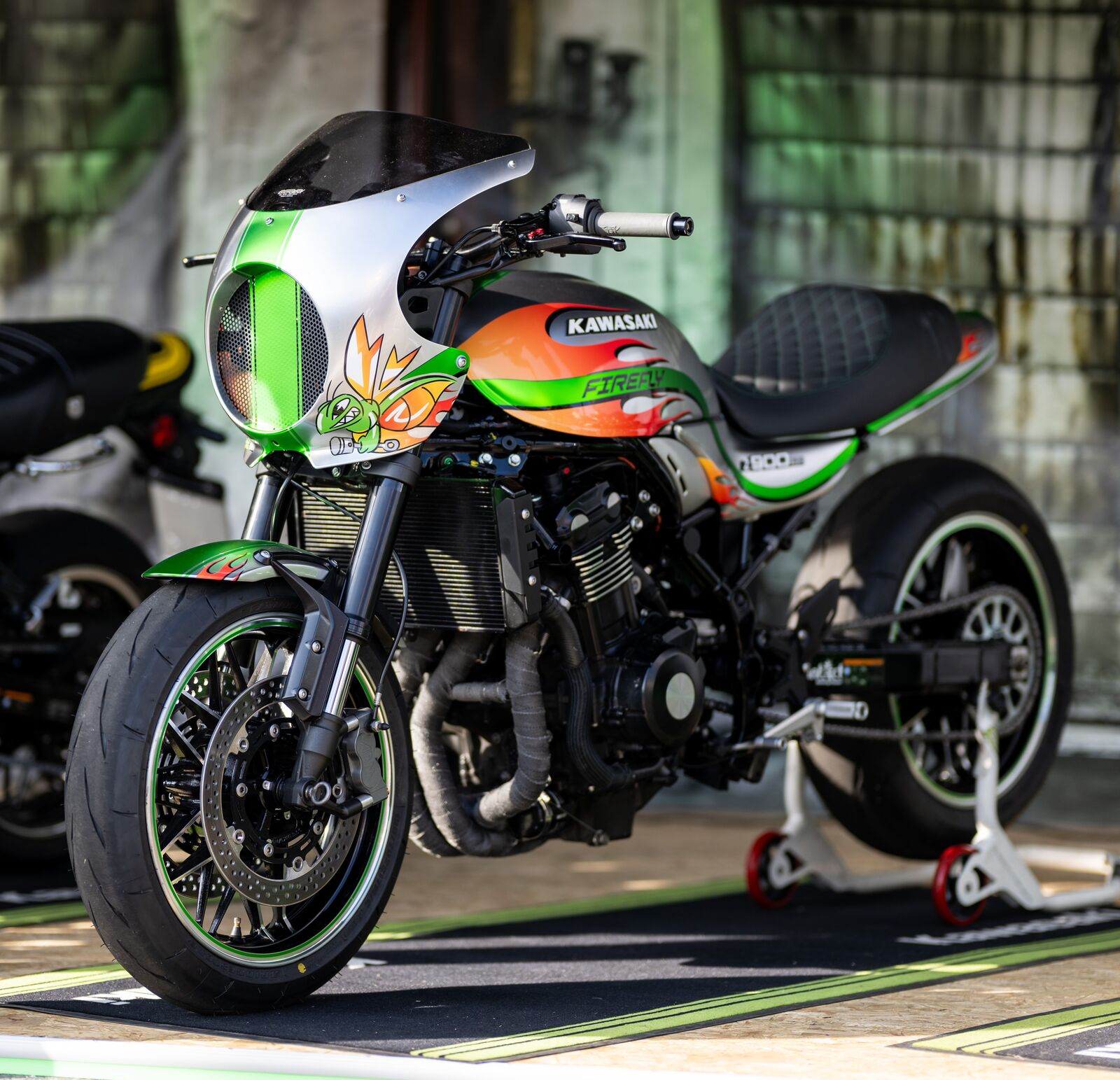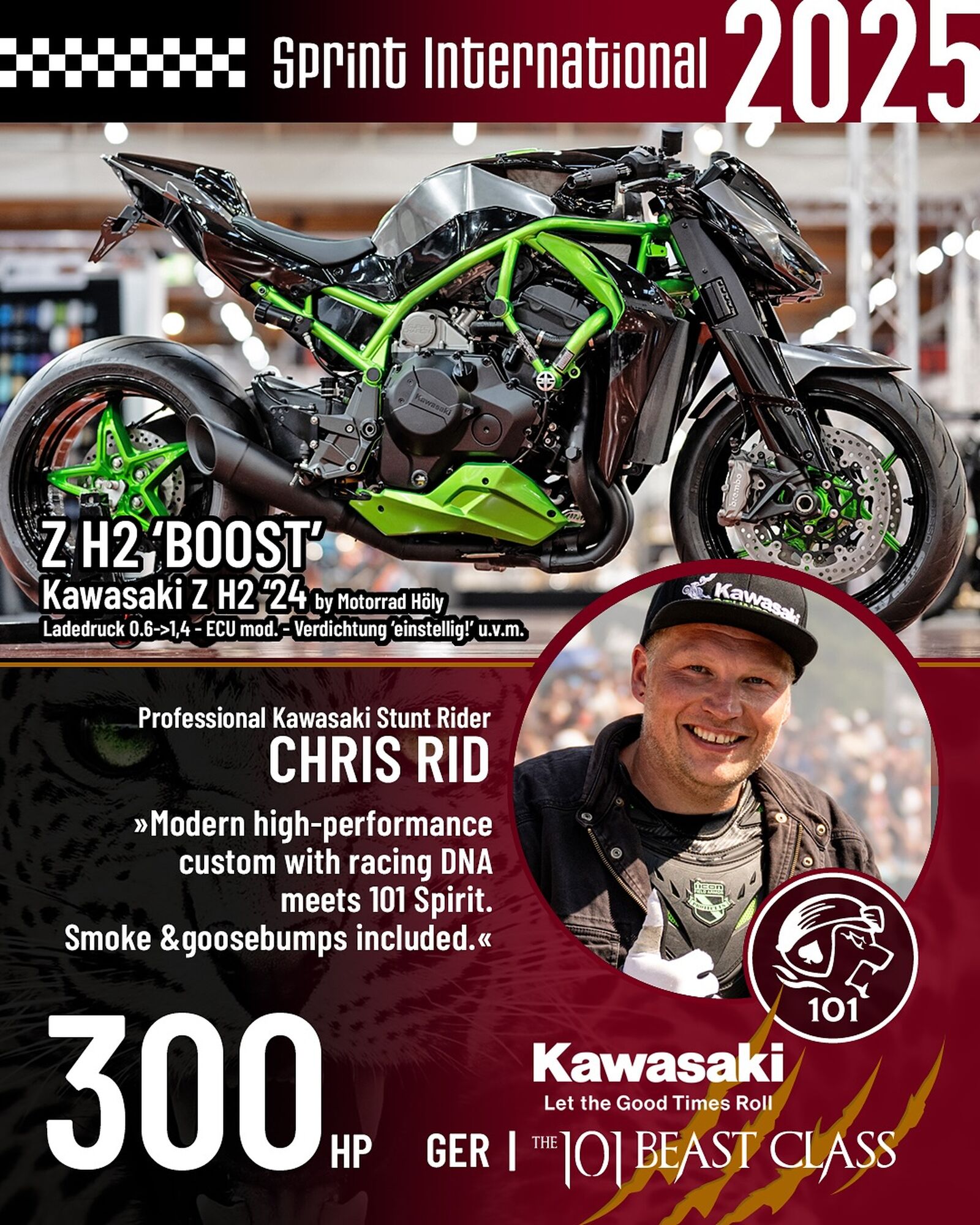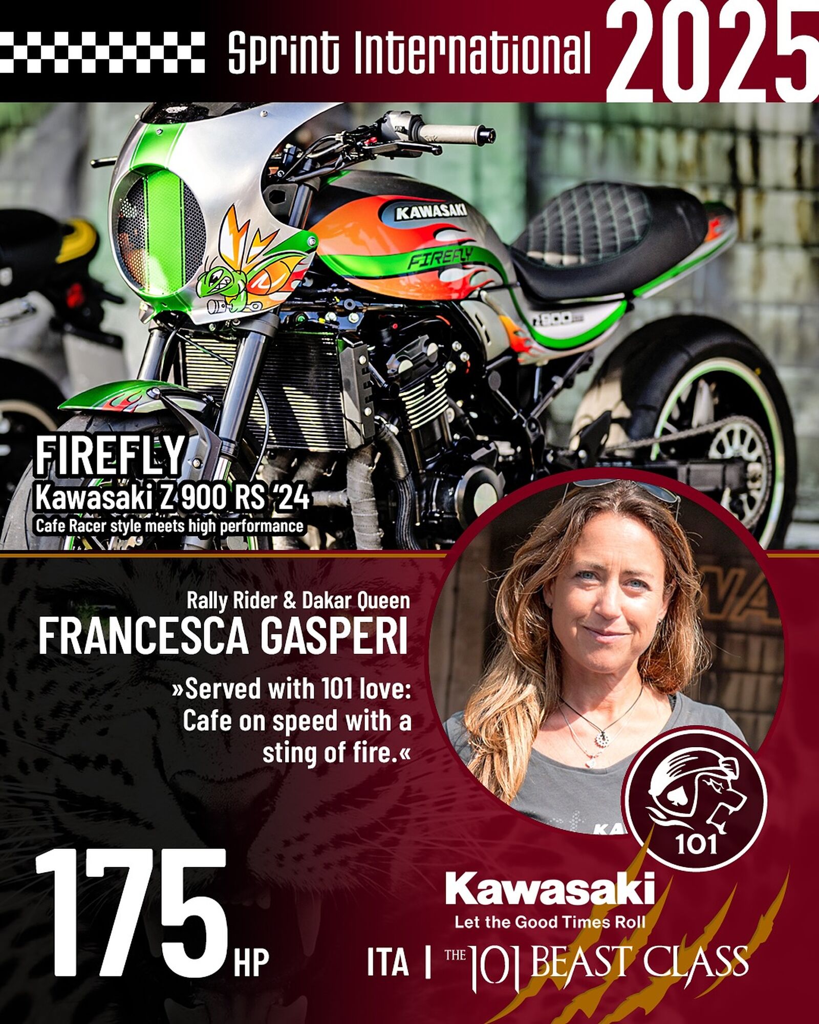 Der deutsche Stuntfahrer Chris Rid – bekannt für seine spektakulären Vorstellungen auf Kawasaki-Motorrädern – tritt mit der speziell für den Sprint getunten Kawasaki Z H2 „BOOST" an. Dieses Einzelstück, veredelt von Motorrad Höly und Tuner Dieter Briese, ist mit einem aufgeladenen Vierzylinder mit 300 PS, erhöhter Verdichtung, modifizierter ECU, offener H2R-Auspuffanlage, Einarmschwinge und 240 mm breitem Hinterrad sowie komplettem Aluminium‑Bodywork ein reines Muskelpaket mit einem Wert von rund 58.000 Euro. Zusammen mit Chris Rid sind actiongeladene Starts garantiert, die Kawasaki Fans nicht verpassen sollten. Nicht minder eindrucksvoll ist der Auftritt von Francesca Gasperi, die als „Rally-Queen" bei Offroad-Langstreckenrennen wie der Africa Eco Race internationale Erfolge feierte. Gasperi bringt ihre Erfahrung nun auf Asphalt ein und steuert die Kawasaki Z 900 RS CAFE „Firefly" ins Sprint-Geschehen. Auf Basis der beliebten Z 900 RS CAFE entstand ein technisch wie optisch einzigartiges Projekt. Mit scharfen Nockenwellen, polierten Pleueln, erhöhter Verdichtung und einer 4-in-1-Abgasanlage von Akrapovic/SC Project leistet sie rund 175 PS. Eine verlängerte Schwinge, spezielle Fahrwerkskomponenten, ABM-Bremsscheiben, eine von Höly gefertigte Sitzbank sowie eine Speziallackierung von R.H. Motorradlacke verleihen der Kawasaki einen unverwechselbaren Charakter. Der Wert des Einzelstücks liegt bei etwa 23.000 Euro.