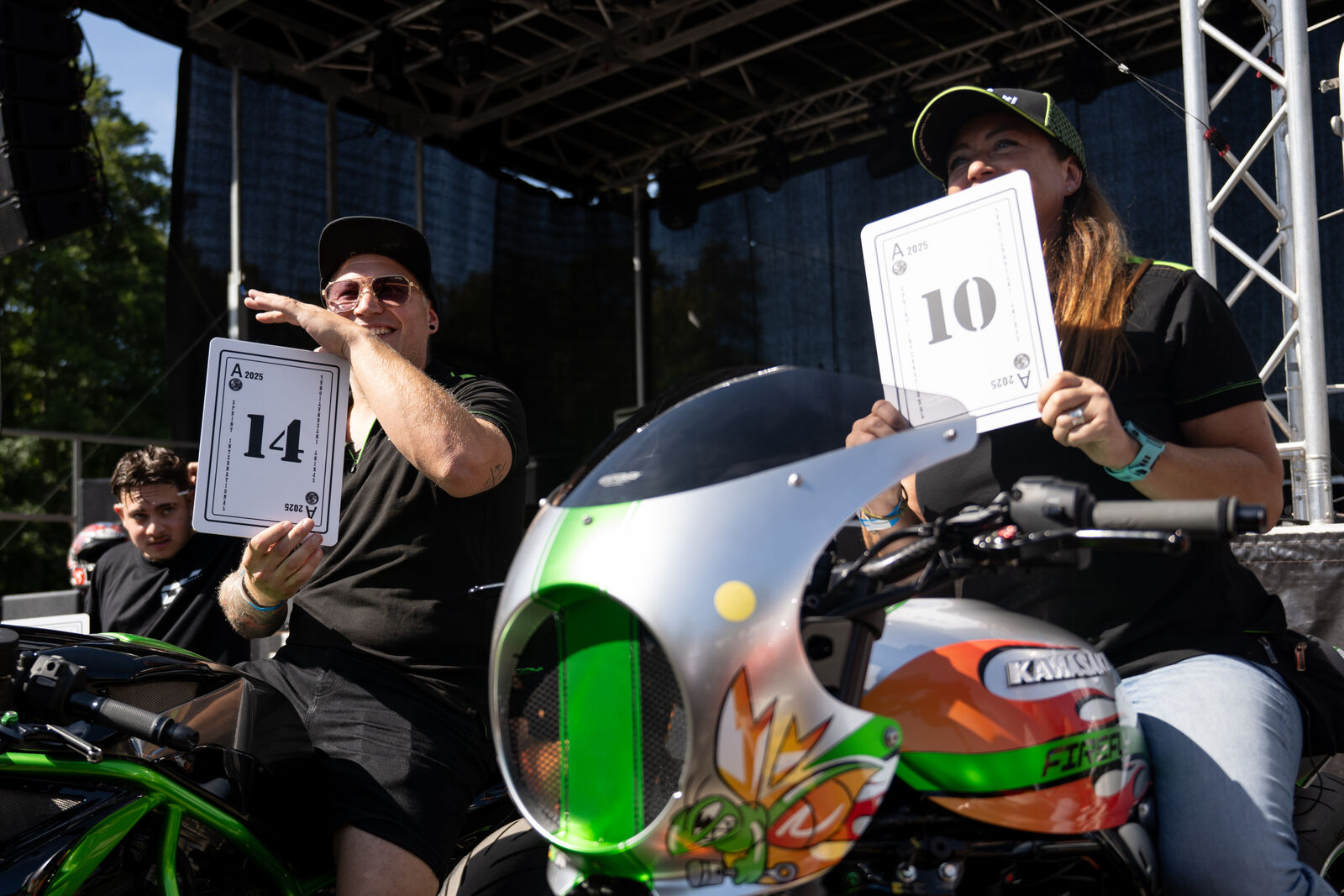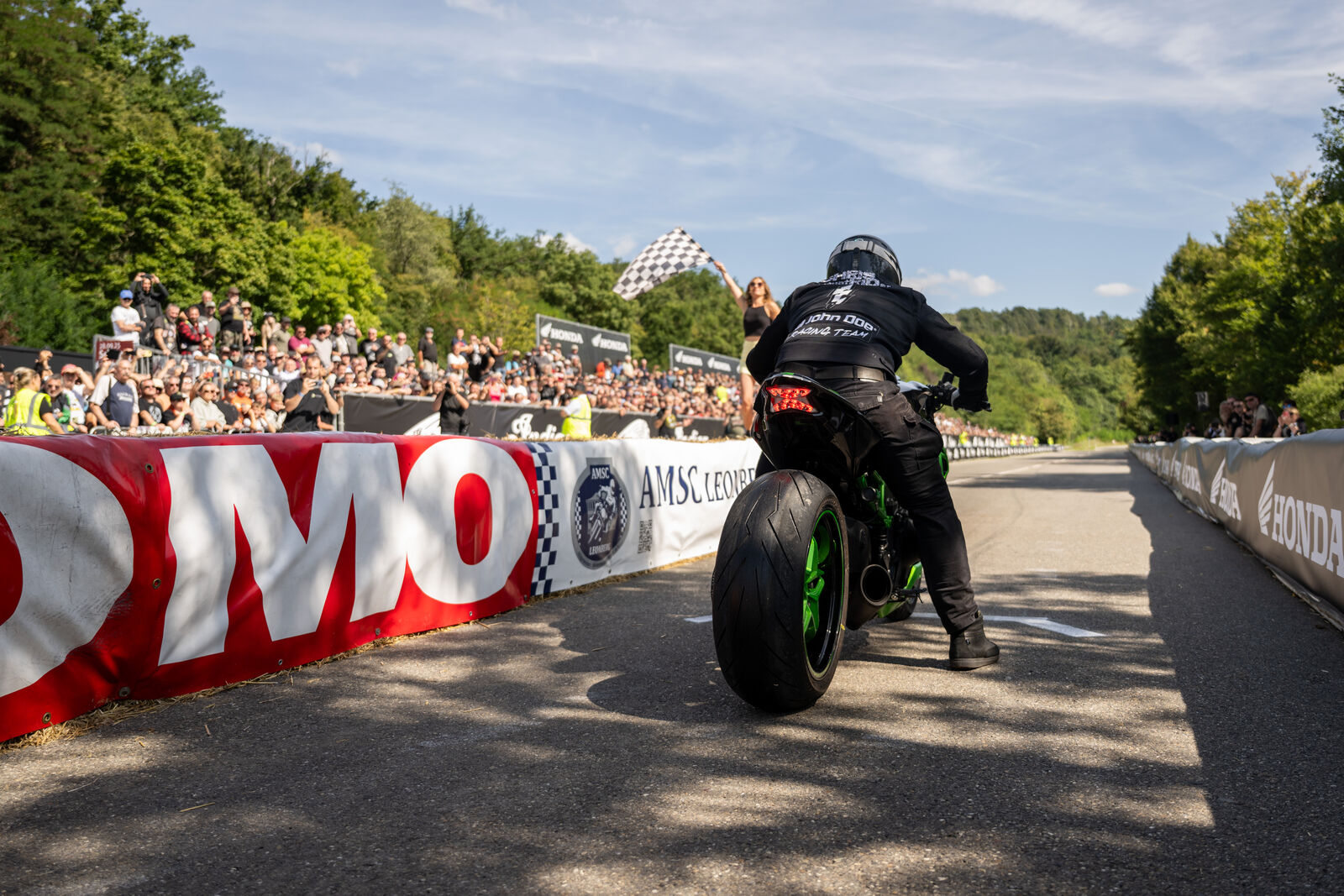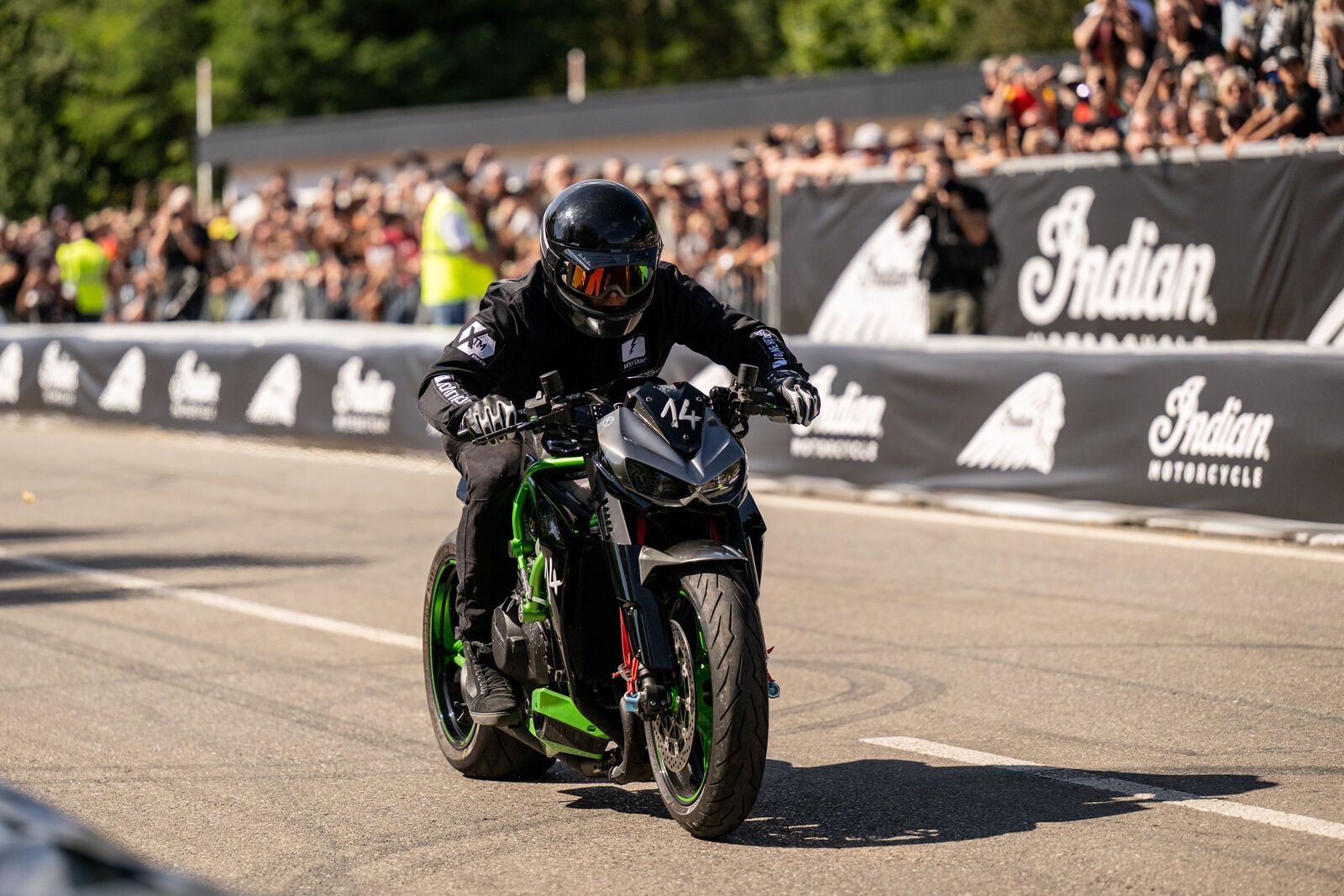 Kawasaki stiftete attraktive Preise für die Verlosung – darunter ein original Kawasaki WSBK-Balance-Bike und ein LEGO-Technic-Modell der Ninja H2R. Ein weiterer Höhepunkt war Kawasakis Teilnahme an den berühmten 1/8-Meile-Sprints, die den Herzschlag des Glemseck 101 ausmachen. Mit zwei spektakulären Bikes sorgte Kawasaki für Furore: Stuntfahrer Chris Rid pilotierte die rund 300 PS starke Kawasaki Z H2 „BOOST“, ein kompromissloses Sprint-Bike, das in Zusammenarbeit mit Motorrad Höly und Dieter Briese entstand. Ergänzt wurde der Auftritt durch die Z 900 RS CAFE „Firefly“, gefahren von Francesca Gasperi. Die italienische Offroad-Langstreckenpilotin lieferte mit dem rund 175 PS starken Unikat eine starke Show auf der Strecke ab und begeisterte die Zuschauerinnen und Zuschauer gleichermaßen. Die Atmosphäre entlang der Sprintstrecke war elektrisierend und zog alle in ihren Bann.