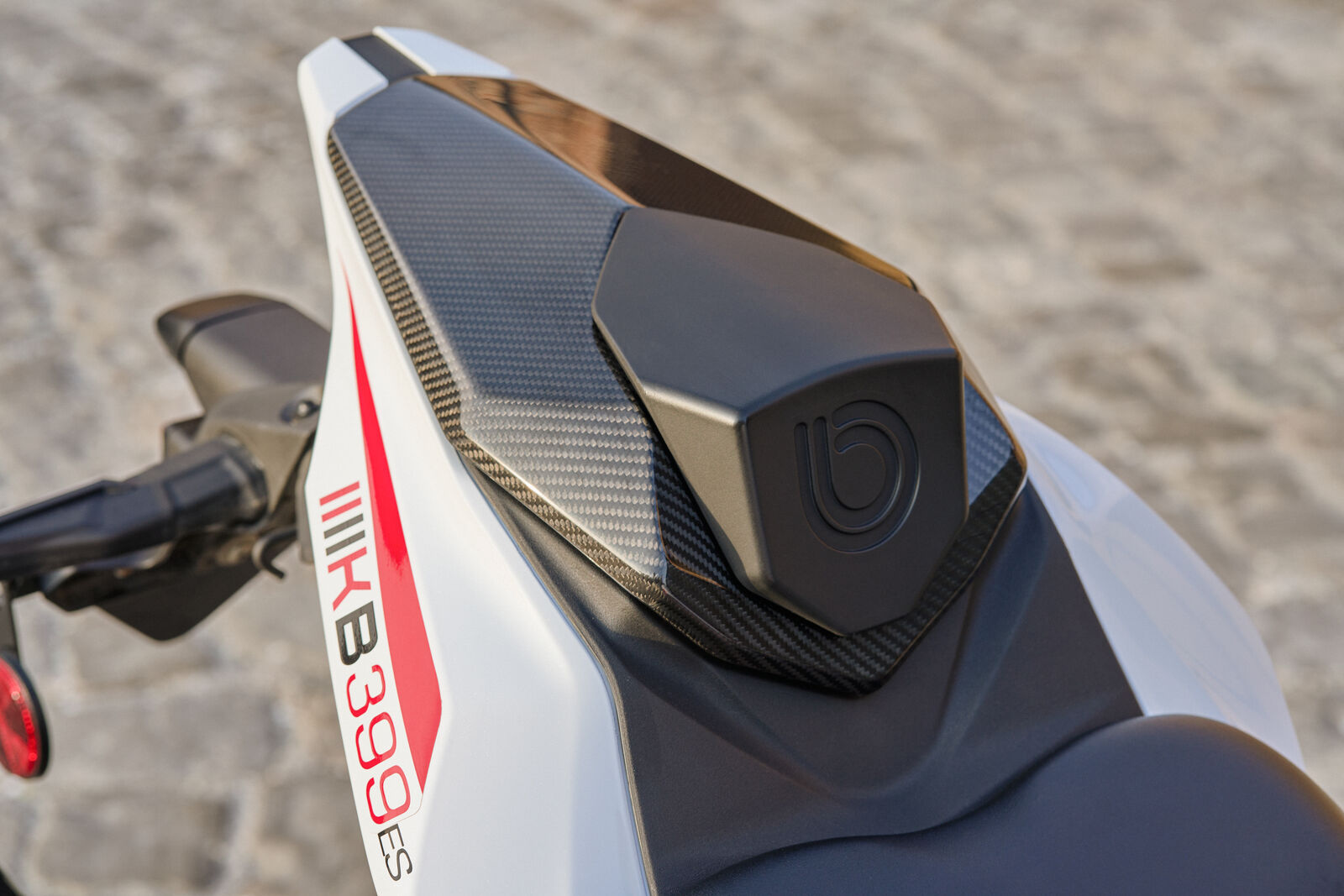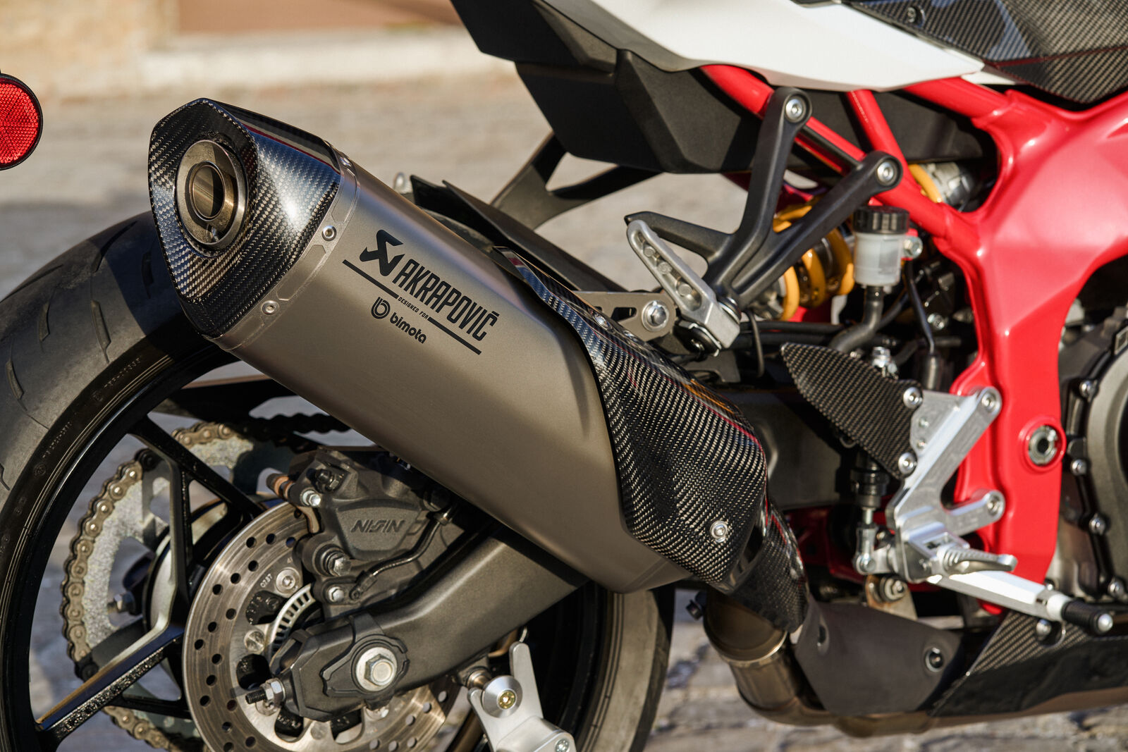 Auf der Straße – und vor allem auf der Rennstrecke – entfaltet die KB399 ihr wahres Potenzial. Die Kombination aus einer 41-mm-Showa-SFF-BP-Gabel und einem Showa-BFRC-lite-Federbein sorgt für messerscharfe Rückmeldung, während die ES-Version mit einem Öhlins STX46 noch einen draufsetzt. Bremsseitig vertraut bimota auf radial montierte Brembo-Stylema-Sättel, die kompromisslose Verzögerung garantieren. Der Sound des Motors, verstärkt durch eine maßgeschneiderte Akrapovič-Anlage, liefert die passende akustische Untermalung. Elektronisch ist alles an Bord, was moderne Performance verlangt: Traktionskontrolle, verschiedene Leistungsmodi, integrierte Fahrprogramme und ein Quickshifter serienmäßig. Das Ergebnis ist ein Motorrad, das nicht nur schnell ist, sondern sich auch jederzeit präzise und kontrollierbar anfühlt.