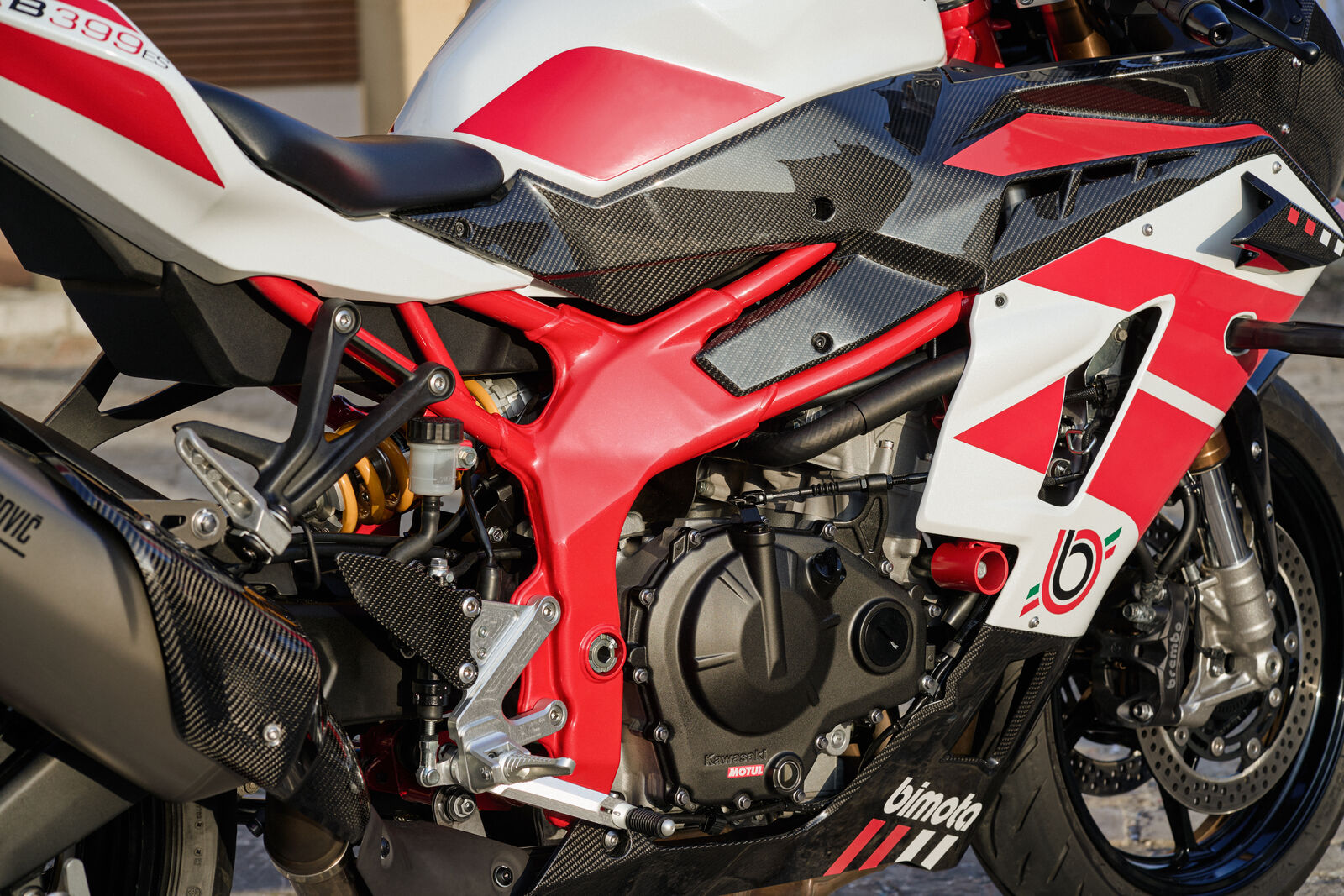 Technisch basiert die KB399 auf der bewährten Plattform der Kawasaki Ninja ZX-4RR, doch was die Ingenieure in Rimini daraus machen, trägt eine ganz eigene Handschrift. Jedes Detail wirkt durchdacht, jedes Bauteil bewusst inszeniert. Die eigens entwickelte Verkleidung mit integrierten Winglets, gefräste Gabelbrücken und die markante Lenkkopfabdeckung zeigen, wie viel Liebe zum Detail in diesem Motorrad steckt. Besonders in der ES-Version wird das Konzept auf die Spitze getrieben: Carbonverkleidung, gefräste Bedienelemente und verstellbare Fußrastenanlagen unterstreichen den exklusiven Anspruch. Optisch bleibt sich bimota treu – Schwarz, Rot und Weiß dominieren, eingerahmt von einem leuchtend roten Chassis, das sofort klarmacht, dass hier kein gewöhnliches Sportbike steht.