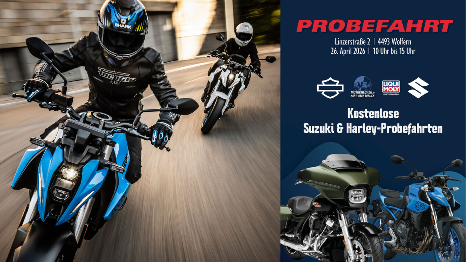 Der Asphalt ruft – und mit ihm die Freiheit, die nur zwei Räder schenken können. Pünktlich zum Saisonstart öffnet sich eine besondere Gelegenheit für alle, die Benzin im Blut haben: Am 26. April 2026 laden wir euch zu kostenlosen Probefahrten der Marke Harley-Davidson und Suzuki ein. Zwischen 10:00 und 15:00 Uhr kannst du im Motochecker-Headquarter die pure Faszination von Harley-Davidson und Suzuki hautnah erleben. Spüre das Vibrieren des Motors, den Wind auf der Haut und diesen einen Moment, in dem du weißt: Genau das ist dein Bike. Wir freuen uns auf Benzingespräche mit euch und wer weiß, vielleicht wartet dein Traummotorrad schon auf dich – steig auf und finde es heraus.
