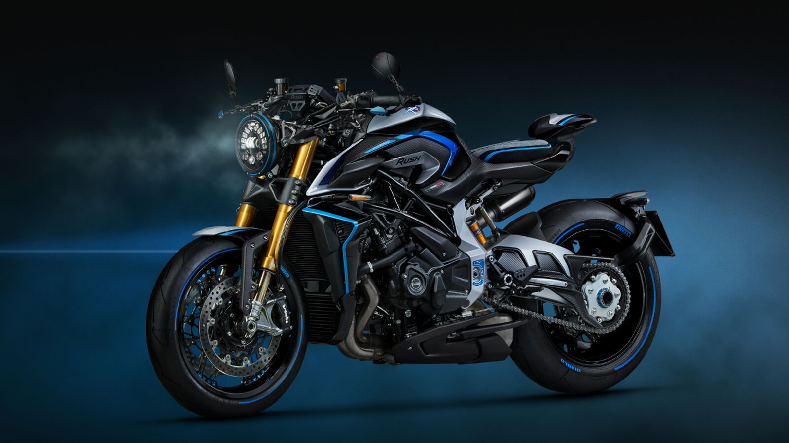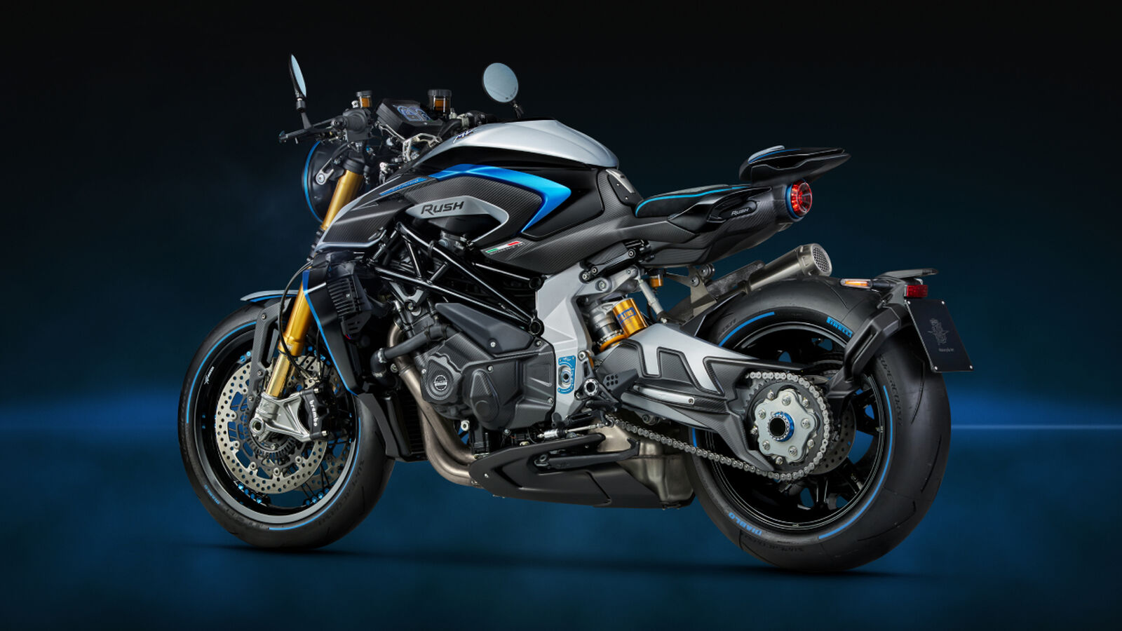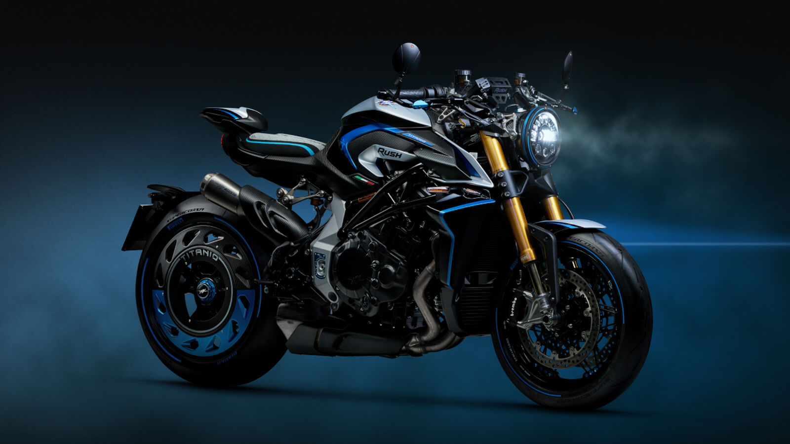 Die Rush Titanio ist das erste Modell mit der neuesten Generation des Öhlins Smart EC 3 semi-aktiven Fahrwerks. Die Spool-Valve-Technologie reagiert bis zu siebenmal schneller als das Vorgängersystem, sodass Dämpfung in Echtzeit an Fahrstil und Straßenbedingungen angepasst wird. Das Event-Based-Control-System analysiert jede Bewegung des Motorrads und integriert ABS, Traktionskontrolle und Wheelie-Kontrolle für ein dynamisches, personalisiertes Fahrerlebnis. Mit den drei Fahrmodi wird das Fahrwerk automatisch auf Straßen- oder Rennbedingungen abgestimmt, während Titanium-Elemente wie Auspuff, Tank- und Armaturenhalter die Leichtbau-Ästhetik unterstreichen. Blu Titanio anodisierte Aluminiumteile, inklusive limitierter Nummerntafel „RUSH Edizione Limitata XXX/300“, runden das exklusive Gesamtpaket ab.