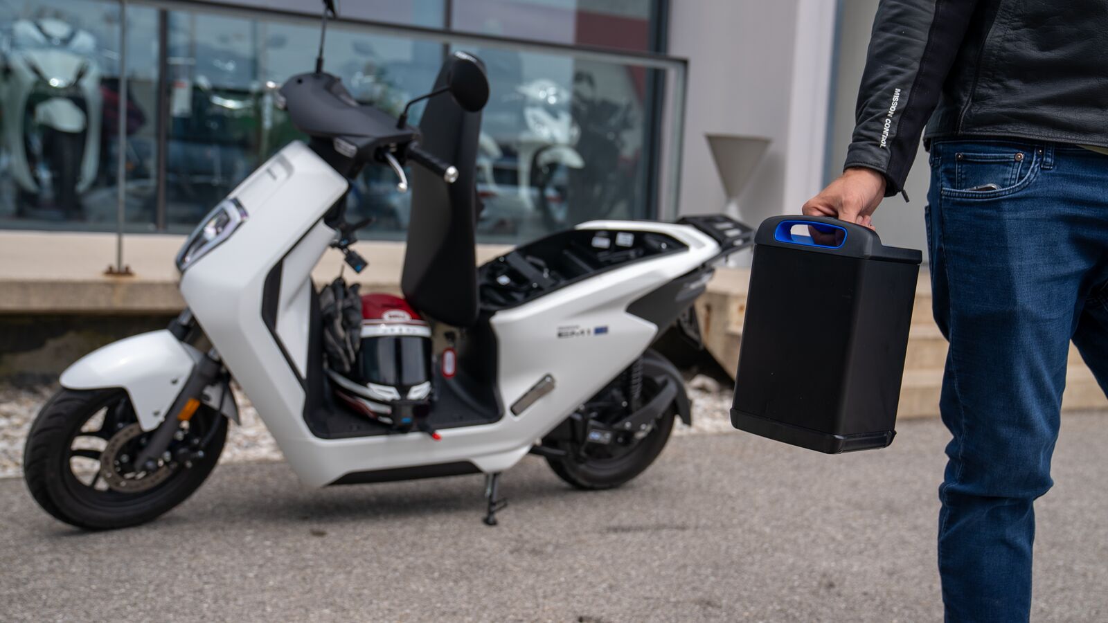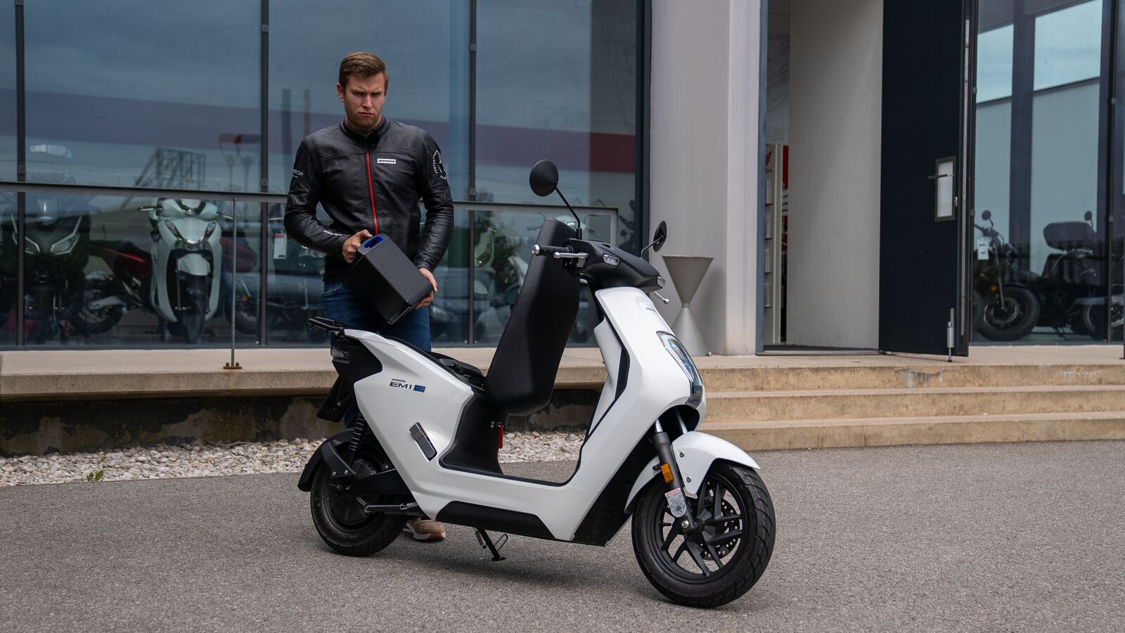 Der Einsatzzweck des EM1 ist relativ klar: Er eignet sich hervorragend für kurze Strecken in der Stadt oder für Ausflüge. Mit einer realistischen Reichweite von etwa 30 Kilometern ist der Roller ideal für den täglichen Pendelverkehr oder für Fahrten zum nächsten Campingplatz. Der EM1 bietet aufgrund seines geringen Gewichts ein einfaches und gutes Handling, was ihn besonders attraktiv für Fahrer macht, die keinen Motorradführerschein besitzen. Du kannst ihn problemlos in einem Wohnmobil oder auf der Rennstrecke mitnehmen. Zudem bietet der Roller ausreichend Stauraum für kleinere Einkäufe oder persönliche Gegenstände – unter dem Sitz gibt es Platz für Kleinigkeiten und mit einem 36-Liter-Topcase kannst du auch größere Dinge transportieren, wie beispielsweise ein Motorradhelm oder ein Sechser-Träger Bier.