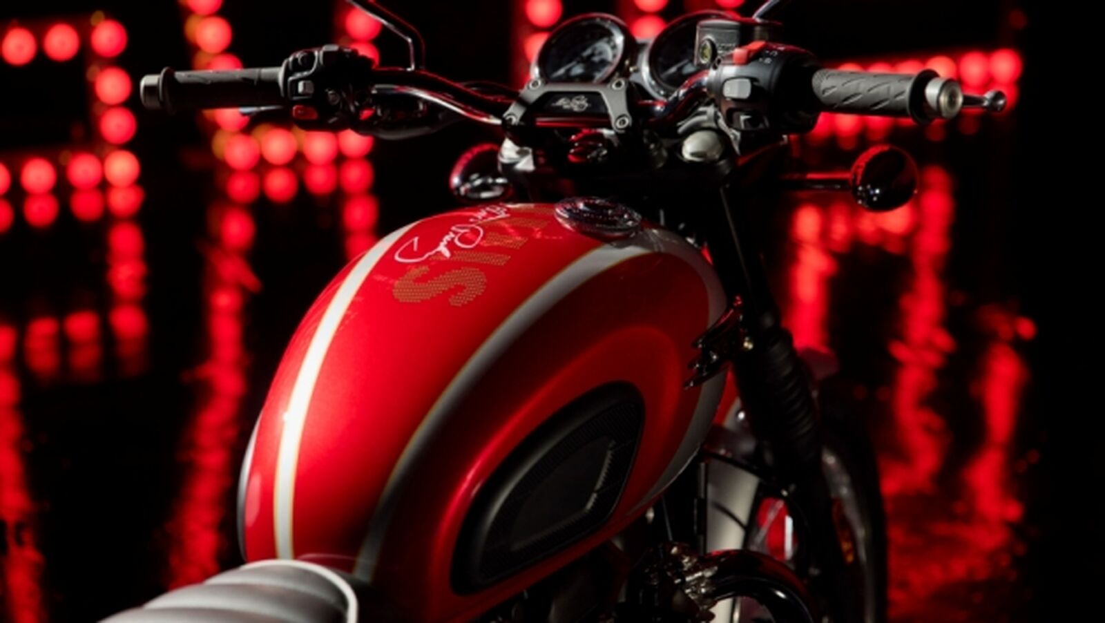 Das Carnival Red des Tanks stammt von einer Custom-Bonneville, die von J Daar 2023 entworfen wurde und zugunsten der Elvis Presley Charitable Foundation versteigert wurde. Die Aluminiumsilber-Streifen auf den Schutzblechen und das hochwertige Chrom-Finish unterstreichen das klassische Design der Bonneville.