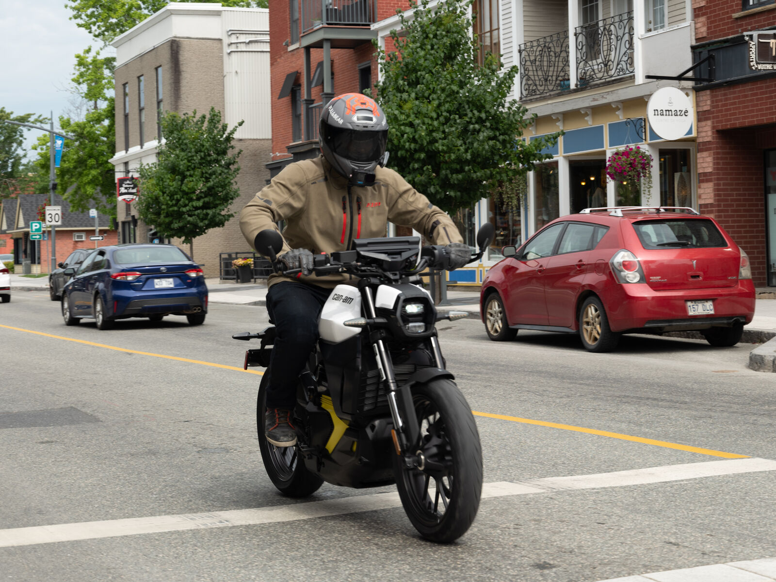 Bei meiner ersten Fahrt mit der Can-Am Pulse war ich positiv überrascht. Die Stadtflitzer-Qualitäten dieser Maschine zeigen sich besonders in ihrem agilen Handling und der Möglichkeit, zwischen verschiedenen Fahrmodi zu wechseln. Im Sport Plus-Modus kann ich mit Leichtigkeit Geschwindigkeiten von bis zu 129 km/h erreichen, was für urbane Verhältnisse mehr als ausreichend ist. Auch die Rekuperation, die ich aktiv steuern kann, hat mir Spaß gemacht. Die Möglichkeit, die Geschwindigkeit durch Rekuperation zu regulieren, gibt dem Fahrer ein ganz neues Gefühl von Kontrolle. Allerdings habe ich festgestellt, dass das Fahrwerk in schnelleren Kurven etwas nervös reagieren kann, was für weniger erfahrene Fahrer eine Herausforderung darstellen könnte.