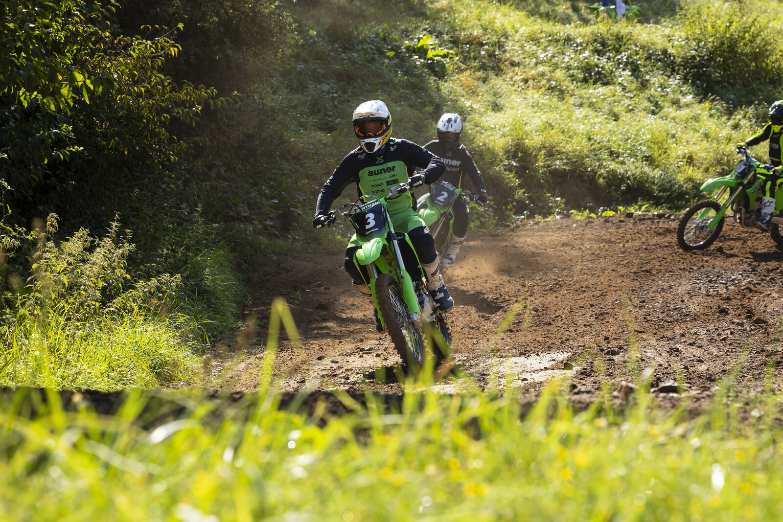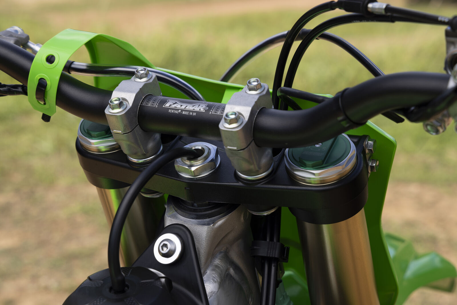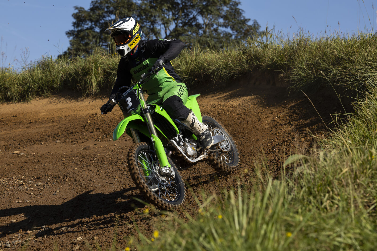 Das Fahrverhalten der KX250F ist einfach beeindruckend. Mit vier Sessions auf einer trockenen Hartstrecke konnte ich die Kraft des Motors und die Stabilität des Rahmens ausgiebig testen. Die Gabel lässt sich leicht anpassen, was dir ermöglicht, den Schwerpunkt nach deinen Vorlieben zu justieren. Ein kleiner Tipp: Wenn du den Gabeldurchschritt um ein paar Millimeter erhöhst, verbessert sich das Kurvenverhalten erheblich.