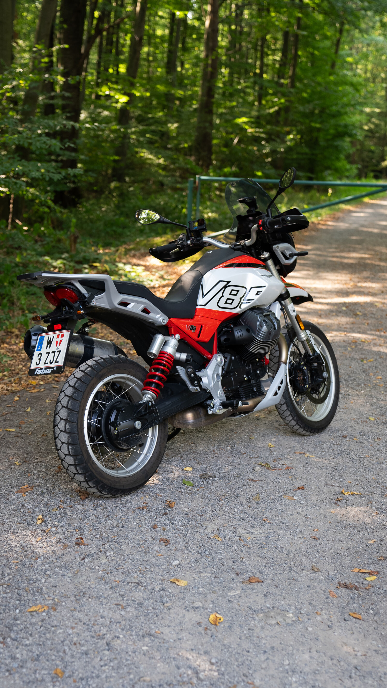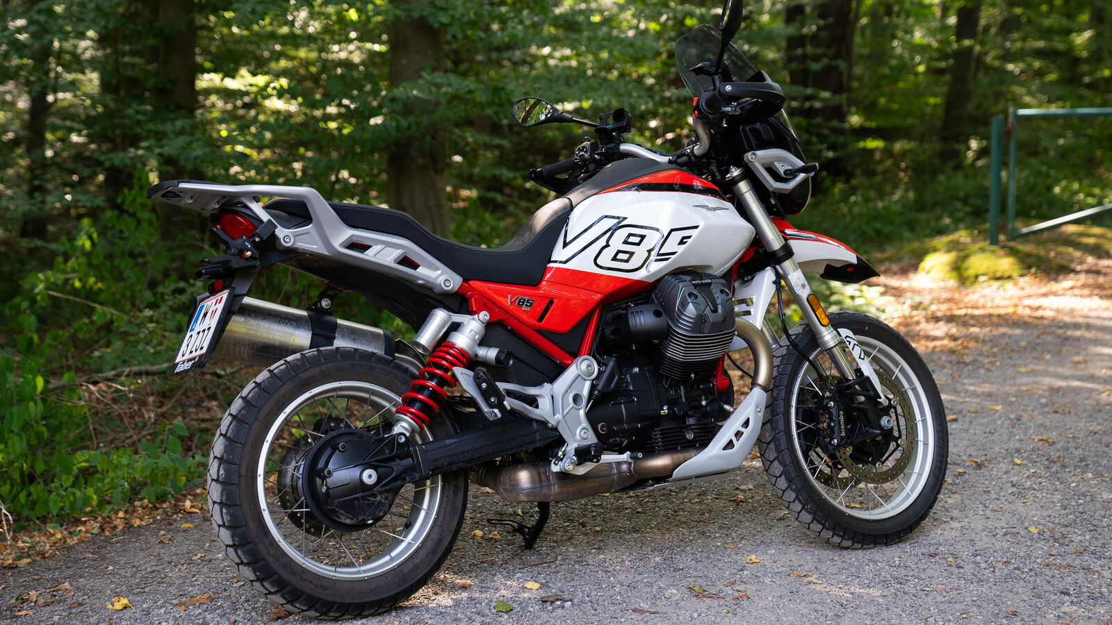 Das Fahrwerk der V 85 TT ist so konzipiert, dass es sowohl auf der Straße als auch abseits der befestigten Wege eine gute Figur macht. Mit einer 41-Millimeter-Upside-Down-Gabel und einem voll einstellbaren Federbein bietet die V 85 TT 170 Millimeter Federweg, was dir sowohl Komfort als auch Kontrolle beim Fahren auf Schotterpisten und Landstraßen gibt. Die 19-Zoll-Räder vorne und 17-Zoll-Räder hinten sorgen dafür, dass die V 85 TT spielerisch durch Kurven gleitet und auch unebene Oberflächen gut meistert. Wenn du also mal auf einen kleinen Schotterweg abbiegen möchtest, brauchst du dir keine Sorgen zu machen – die Moto Guzzi wird dir treu zur Seite stehen, als wäre sie dein bester Freund auf zwei Rädern.