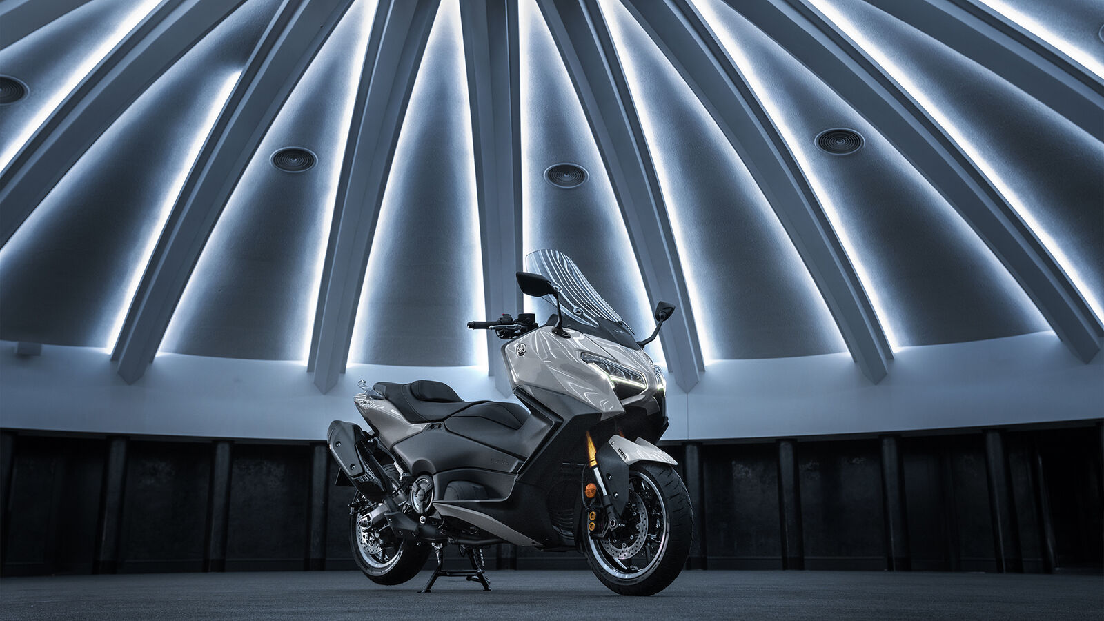 Yamaha setzt beim Design des TMAX auf eine Kombination aus ikonischen Stilelementen und modernen Updates. Die neuen Dual-Scheinwerfer in der Frontpartie verleihen dem Roller eine sportlichere und aggressivere Optik, die dennoch den charakteristischen Look des Modells beibehält. Die kürzere und schärfer konturierte Frontverkleidung erzeugt eine kompakte Silhouette, die mit den bekannten Bumerang-förmigen Seitenteilen harmoniert. Weitere Elemente wie der hochgezogene Auspuff und die konturierte Doppelsitzbank unterstreichen den Premium-Charakter des TMAX. Der TMAX Tech MAX kommt in exklusiven Farben wie Ceramic Grey und Dark Magma und punktet mit hinterleuchteten Lenkerschaltern sowie gefrästen Felgen, die sein luxuriöses Erscheinungsbild ergänzen.