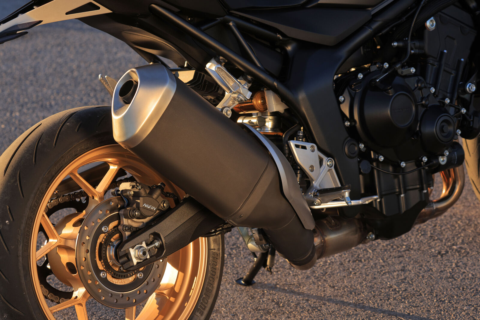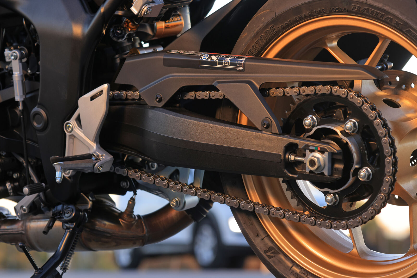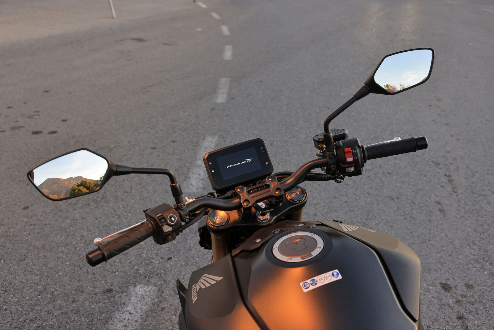 Das Fahrwerk der Hornet SP ist ein weiteres Highlight. Die SP-Version ist mit einem hochwertigen Öhlins TTX36 Stoßdämpfer ausgestattet, während die Standardversion mit einem einfacheren Stoßdämpfer auskommt. Die Showa Big Piston Gabel mit 41 mm Durchmesser bietet sowohl vorne als auch hinten eine einstellbare Dämpfung, die sich gut an unterschiedliche Fahrbedingungen anpassen lässt. Die Sitzhöhe von 809 mm und die schmale Taille sorgen dafür, dass auch kleinere Fahrer gut mit der Hornet zurechtkommen. Der Radstand von 1456 mm und der Lenkkopfwinkel von 25° ermöglichen ein schnelles Einlenken und eine agile Fahrweise. Dennoch sollte man beachten, dass die Schräglagenfreiheit nicht immer optimal ist und bei unsachgemäßer Fahrweise die Fußrasten möglicherweise den Boden berühren.