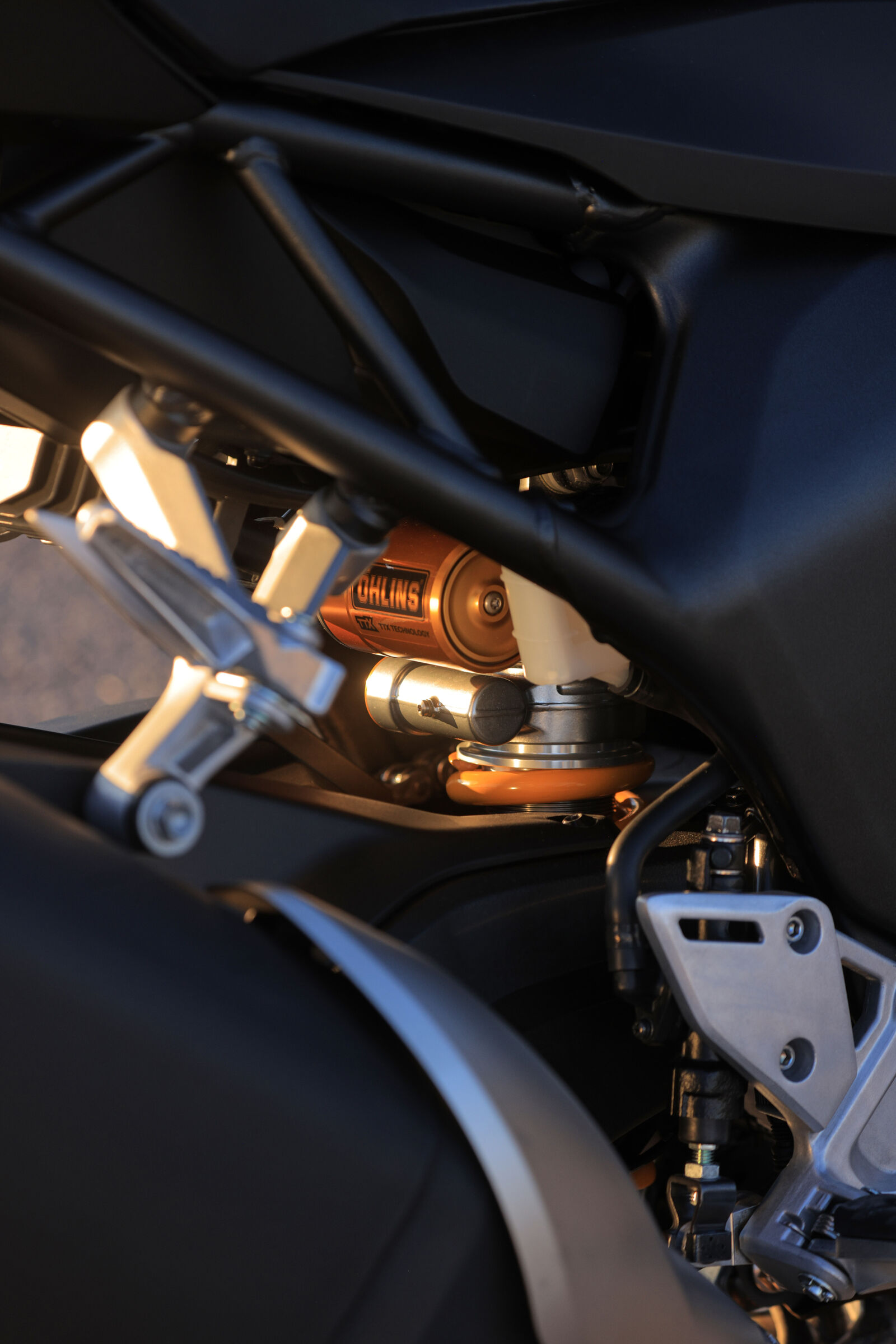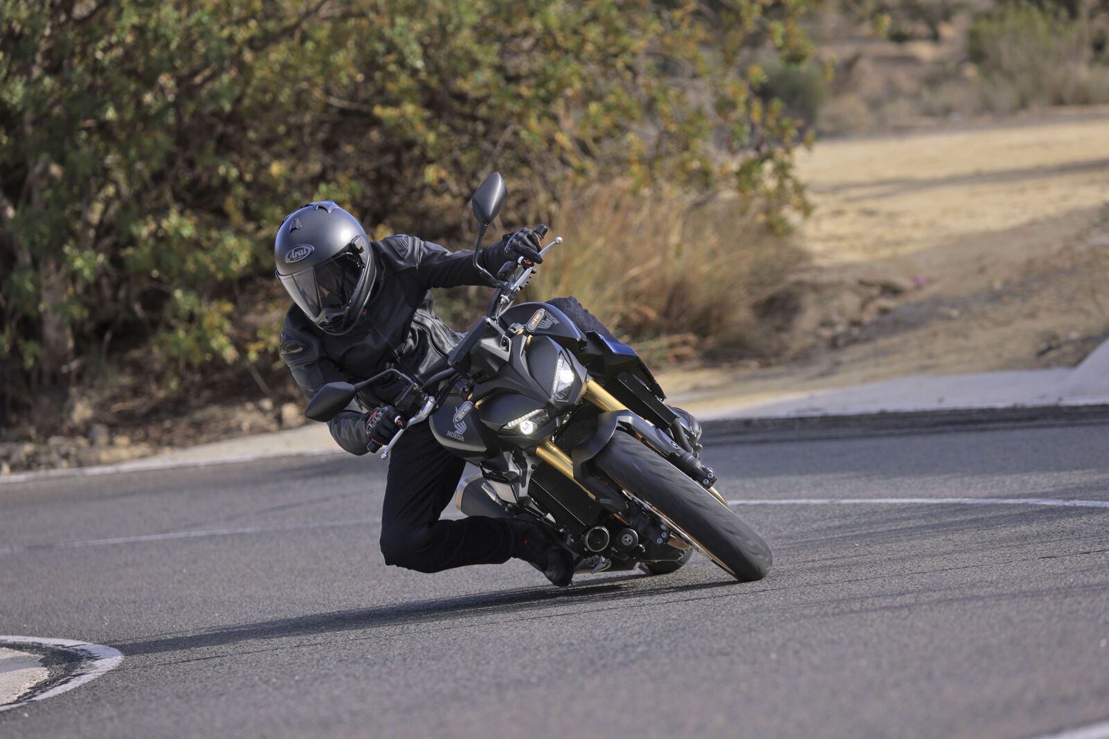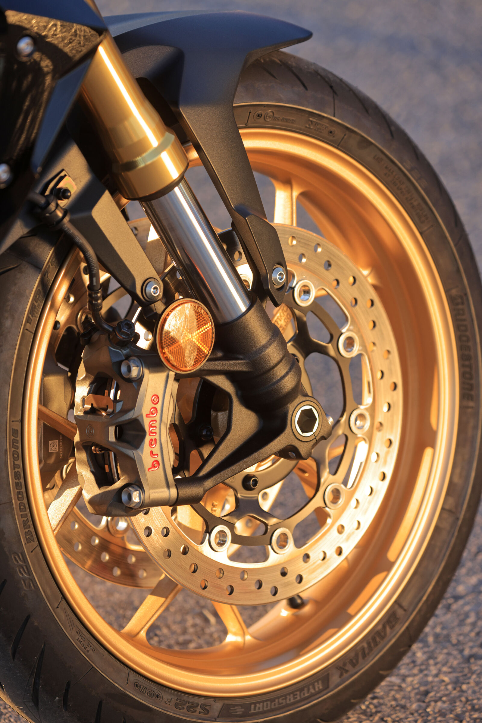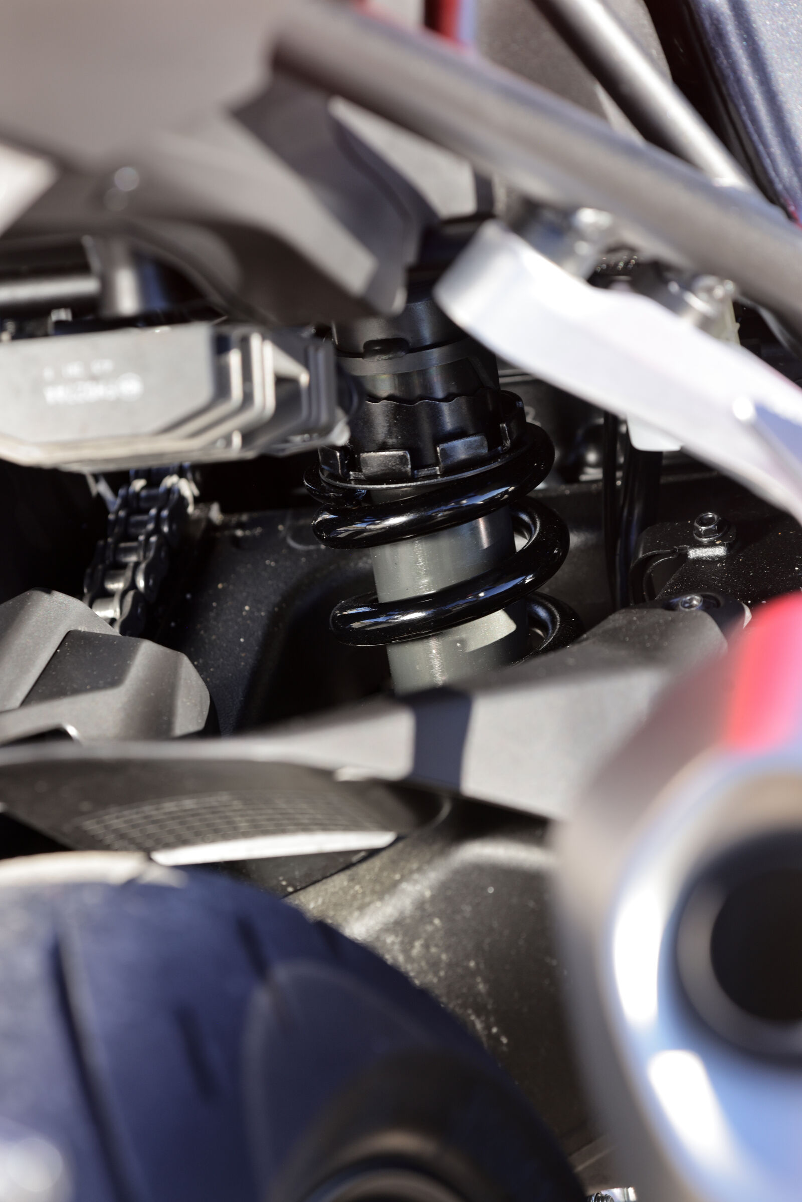 Das Fahrwerk der Hornet SP ist ein weiteres Highlight. Die SP-Version ist mit einem hochwertigen Öhlins TTX36 Stoßdämpfer ausgestattet, während die Standardversion mit einem einfacheren Stoßdämpfer auskommt. Die Showa Big Piston Gabel mit 41 mm Durchmesser bietet sowohl vorne als auch hinten eine einstellbare Dämpfung, die sich gut an unterschiedliche Fahrbedingungen anpassen lässt. Die Sitzhöhe von 809 mm und die schmale Taille sorgen dafür, dass auch kleinere Fahrer gut mit der Hornet zurechtkommen. Der Radstand von 1456 mm und der Lenkkopfwinkel von 25° ermöglichen ein schnelles Einlenken und eine agile Fahrweise. Dennoch sollte man beachten, dass die Schräglagenfreiheit nicht immer optimal ist und bei unsachgemäßer Fahrweise die Fußrasten möglicherweise den Boden berühren.