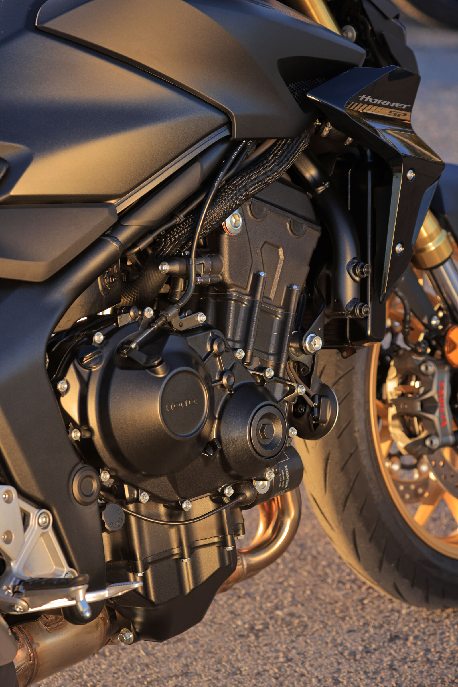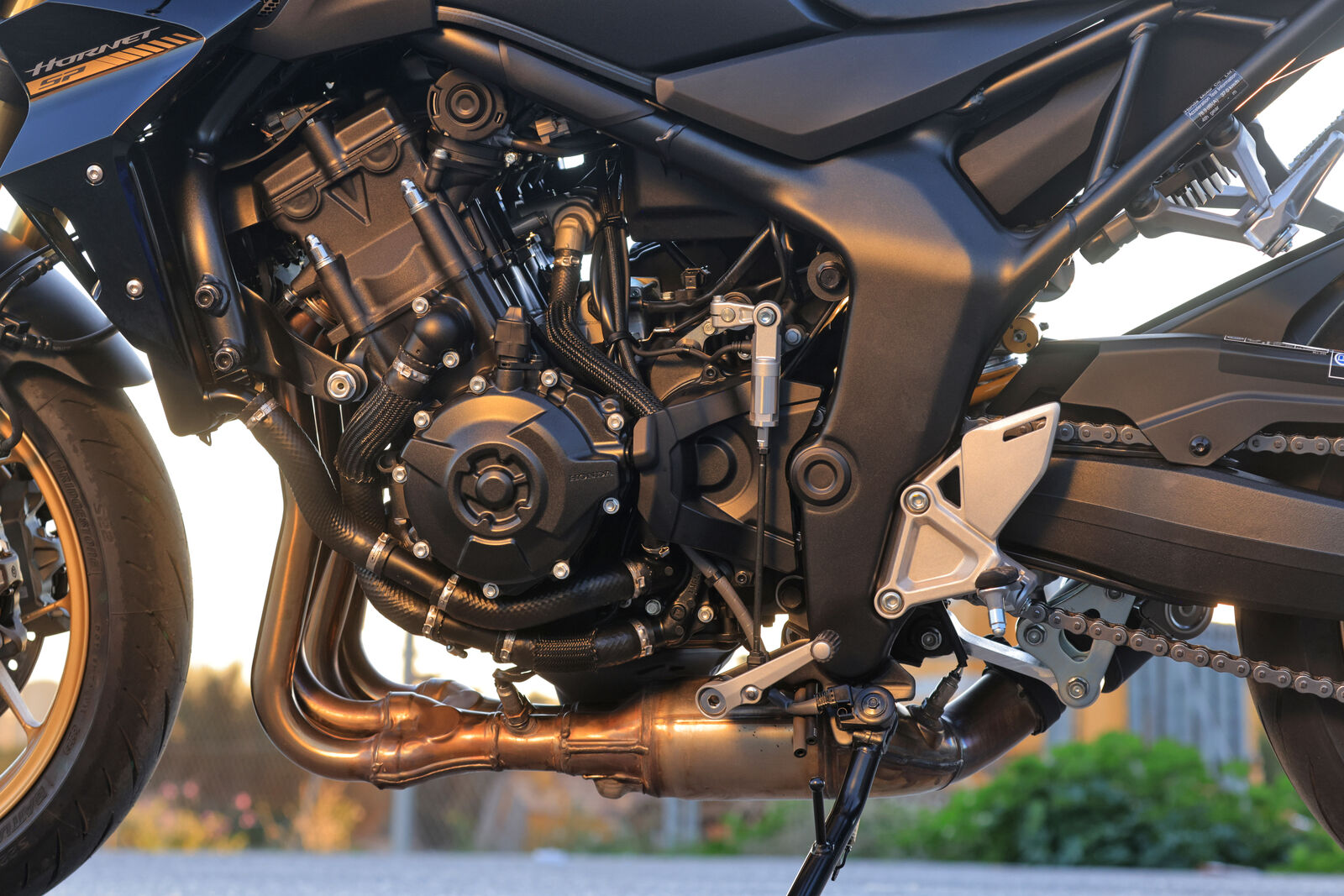 Der Motor der Hornet ist ein ehemaliger Fireblade-Motor, der sich durch seine Drehfreudigkeit auszeichnet. Der Motor benötigt Drehzahl, um sein volles Potenzial auszuschöpfen, was bedeutet, dass die Leistung erst ab 8000 Umdrehungen wirklich zur Geltung kommt. Dies kann für Fahrer, die eine gleichmäßige Leistung über das gesamte Drehzahlband erwarten, eine Herausforderung darstellen. Der Motor ist jedoch elastisch und ermöglicht es, in jedem Gang Vollgas zu geben. Trotz der kurzen Übersetzung in den unteren Gängen bleibt er ein Supersport-Aggregat, das vor allem im oberen Drehzahlbereich brilliert. Im direkten Vergleich zur Konkurrenz, wie der Yamaha MT-09 oder Kawasaki Z900, hebt sich die Hornet durch ihre eigene Charakteristik ab, was sie zu einer interessanten Option im Naked-Bike-Segment macht.