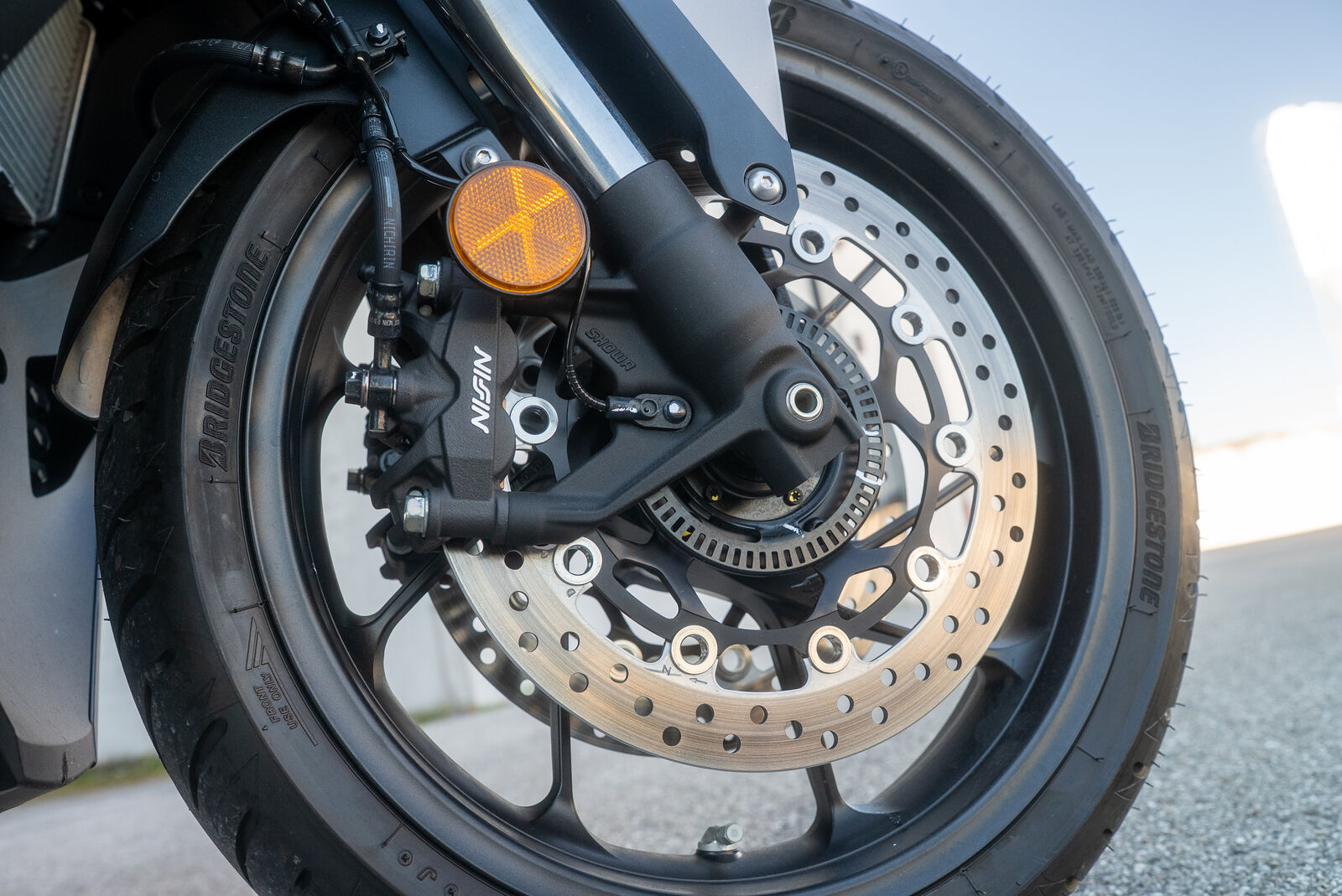 Die Forza 750 verfügt über eine hochwertige 41 mm USD-Gabel vorne und einen Monostoßdämpfer mit ProLink-Aufhängung hinten, die zusammen einen Federweg von 120 mm bieten. Dieses Fahrwerk sorgt für hervorragende Dämpfung und Stabilität, wodurch Unebenheiten mühelos überwunden werden und der Fahrer ein komfortables Fahrgefühl genießen kann, egal ob in der Stadt oder auf langen Strecken.