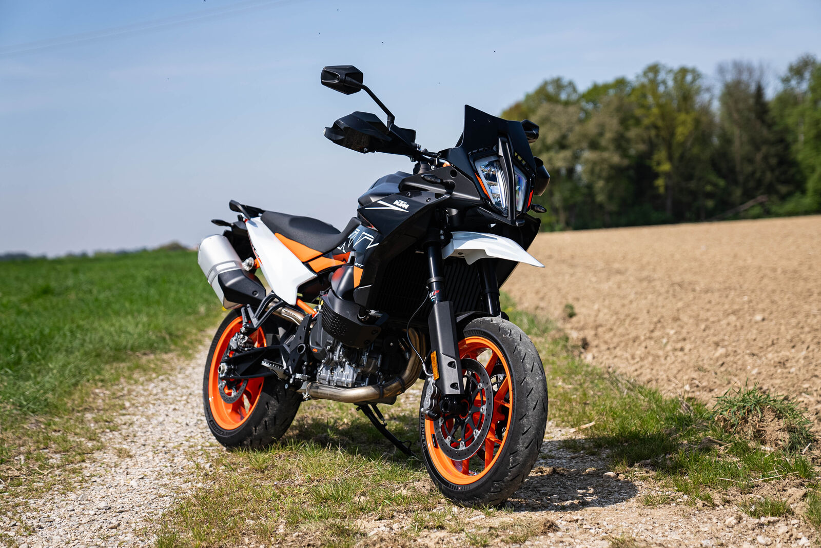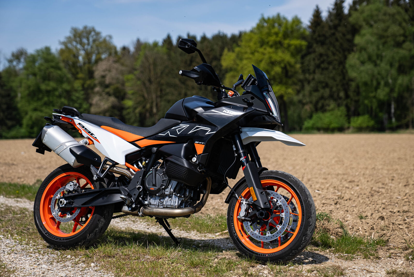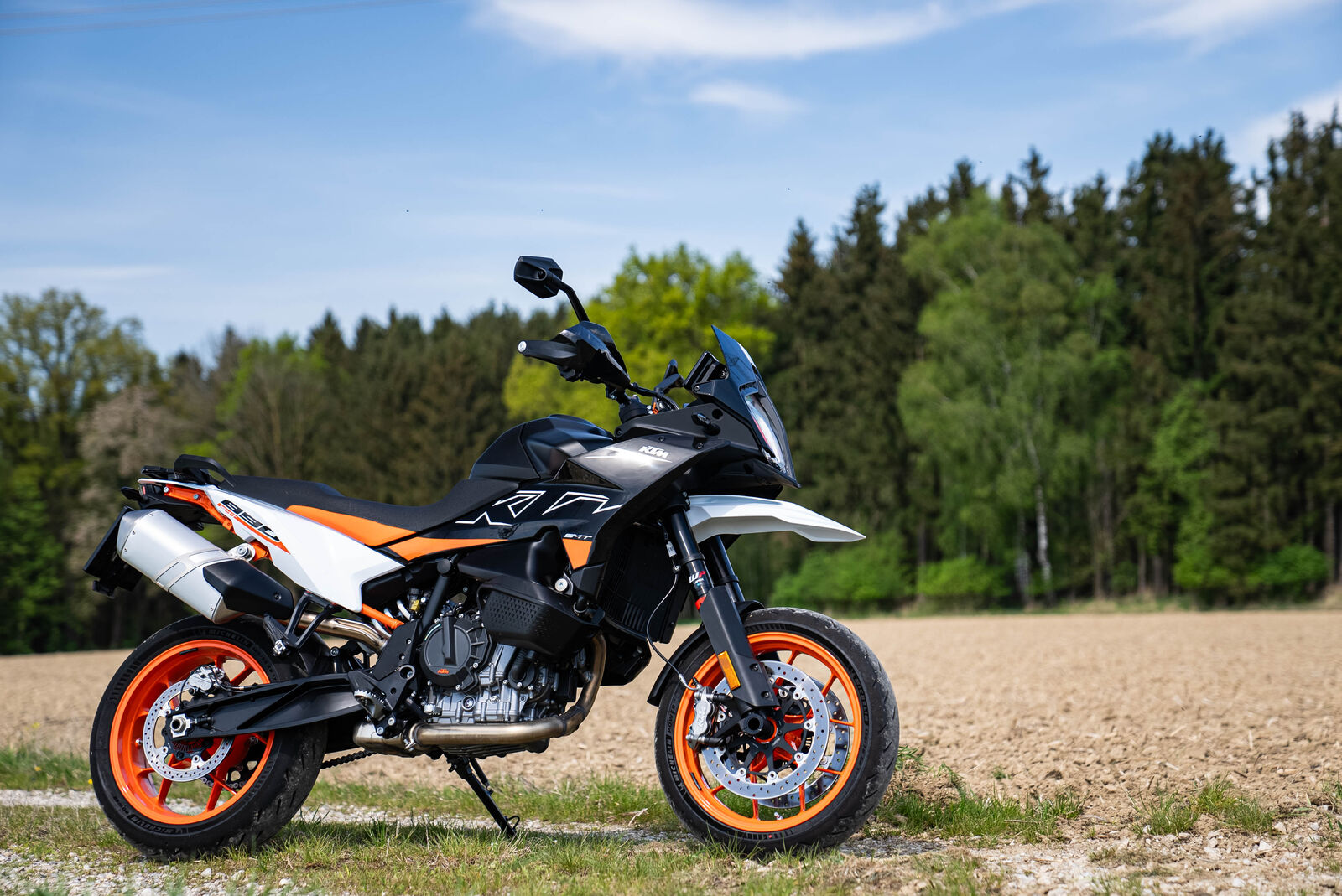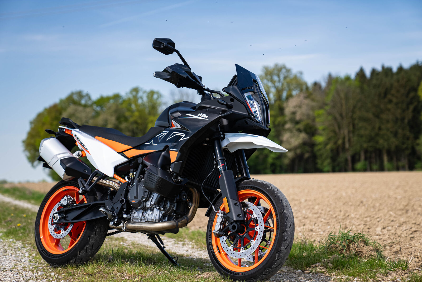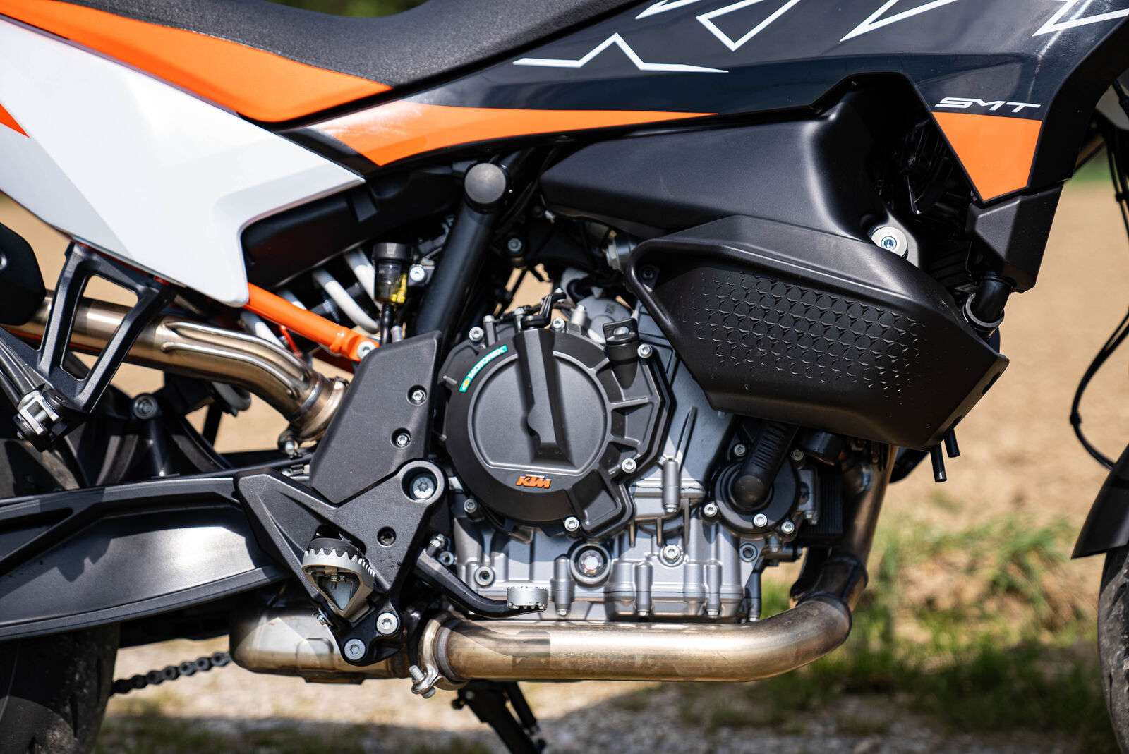 Die KTM 890 SMT wird von einem flüssigkeitsgekühlten Reihen-2-Zylinder-Motor angetrieben, der 105 PS und ein maximales Drehmoment von 100 Nm bei 6.500 U/min liefert. Mit einem Hubraum von 889 ccm und einer Verdichtung von 13,5:1 bietet der Motor eine kraftvolle und agile Performance.