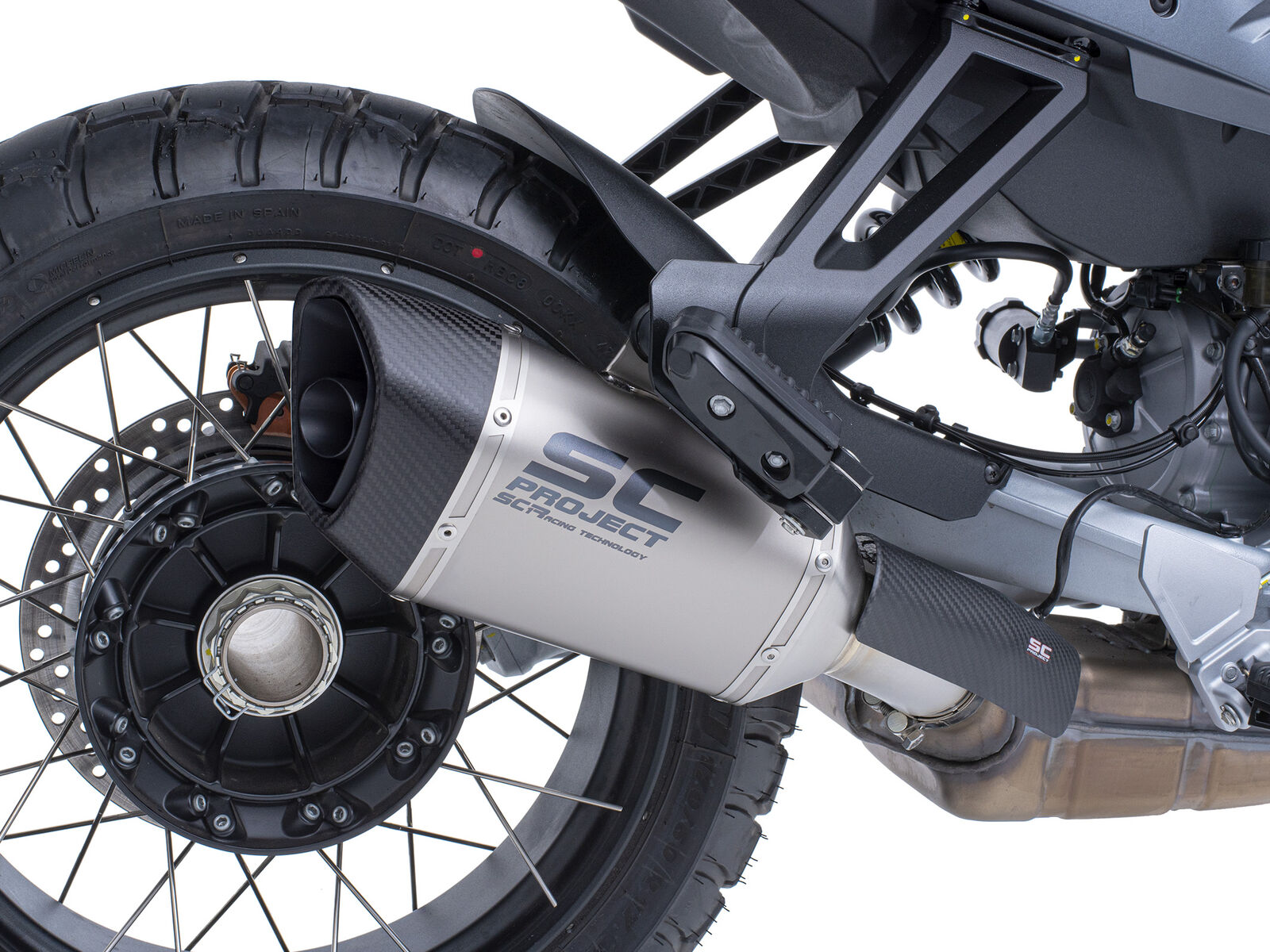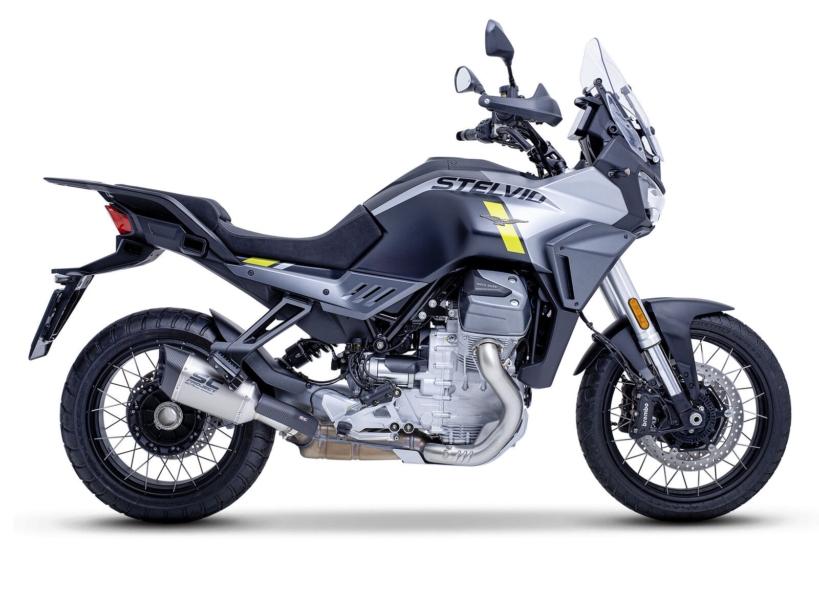 Die MOTO GUZZI Stelvio 2024 lässt sich mit verschiedenen Zubehörteilen individuell anpassen. Ein beliebtes Upgrade ist der SC-Project SC1-R Slip-on-Endschalldämpfer, der nicht nur das Gewicht reduziert, sondern auch die Leistung um bis zu 1,4 PS steigert und den Klang des V2-Motors verstärkt.